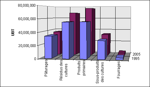 Selon LDPS2 , les besoins en énergie pour la production animale atteindraient en 2005 221 millions d'UBT (1 880 milliards Mcal), soit 1,2 fois les besoins actuels. Cette augmentation se répartit comme suit: 19 millions d'UBT (163 milliards Mcal) pour les bovins, 8 millions d'UBT (71 milliards Mcal) pour les porcs et 8 millions d'UBT (72 milliards Mcal) pour les volailles.