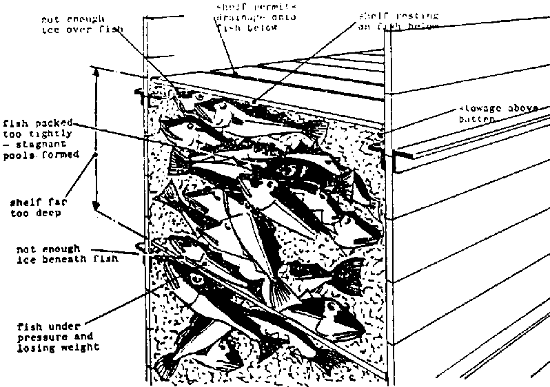 If the box is not big enough for fish and ice, then the fish will almost certainly be stowed in insufficient ice; fish at the bottom of a box with no ice beneath them or fish at the top of the box with no ice above them, will have the bottom of one box, and possibly the lid of another, between them and the nearest layer of ice. Fish under these conditions will cool slowly, if at all, and may spoil very rapidly indeed; fish in direct contact with the surface of the box can also develop sour, bilgy odours very soon after stowage, producing what are sometimes called 'stinkers'.