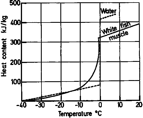 Fish muscle usually contains 60-80 per cent water, depending on species and season, but the tissue fluid contains salts and other compounds in solution and hence the muscle freezes in rather a different manner from water. The change in heat content of white fish muscle and of water when the temperature changes is shown in figure 1; it can be seen that fish has to be reduced to a much lower temperature than water before most of the heat is removed and the fish is completely frozen.