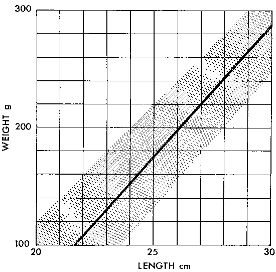 Rainbow trout grow and put on weight more quickly than other species of trout, and are thus particularly suitable for fish farming. The demand in the UK market is mainly for trout 150-300 g in weight, equivalent to a length of 24-30 cm, a size that can be achieved in 1 1/2-2 years. Rainbow trout can grow to a length of 50 cm during the third year, but there are few outlets for fish of this size. Weights in excess of 23 kg for non-migratory fish and 16 kg for migratory fish are on record for rainbow trout in the wild. The typical relationship between length and weight of farmed rainbow trout in the UK is shown in Figure 2.