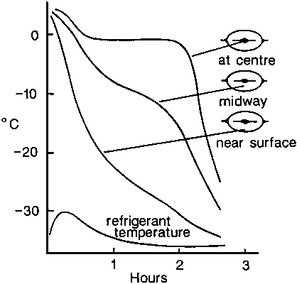In the example shown here the apparent freezing time to -20°C can vary from less than one hour to 2½ hours, depending on where in the fish the temperature is measured. The shape of a temperature-time curve measured at the thermal centre is characterised by a pause at a steady temperature somewhere between 0 and -2°C, followed by a rapid decrease to near the temperature of the freezer.