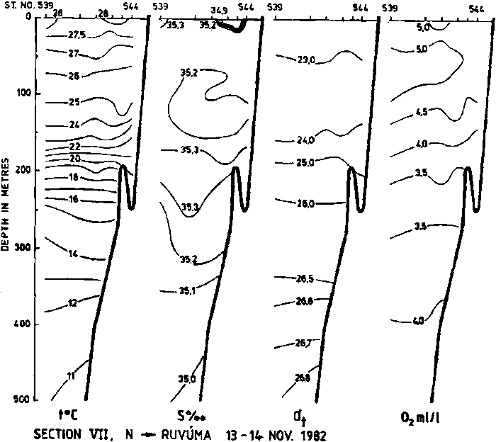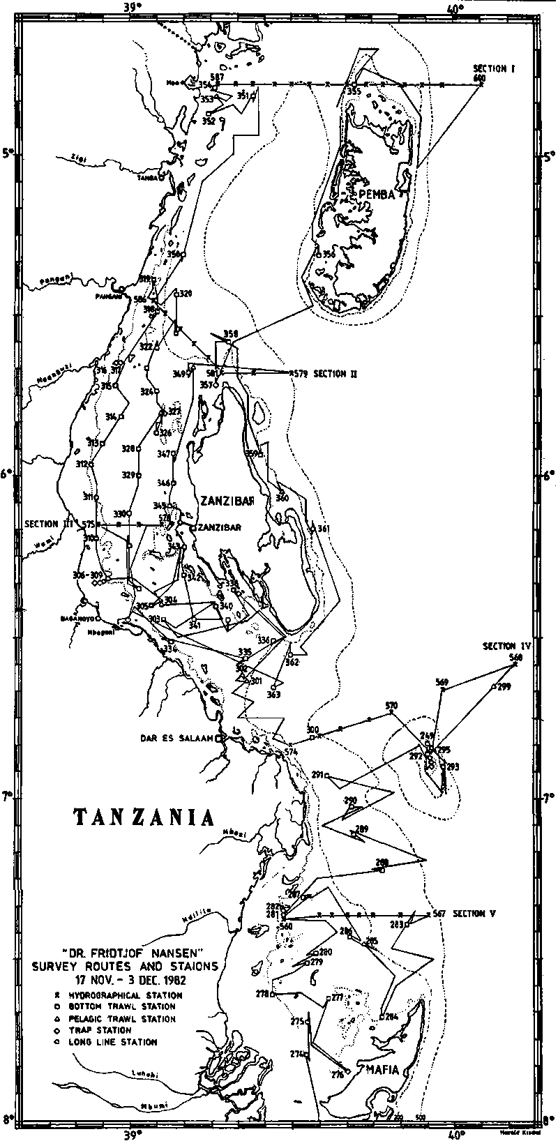 Four demersal trawl stations in the western part of the Zanzibar Channel (Stations 312 - 315) were worked by F/V Mafunzo and R/V Dr. Fridtjof Nansen. The depth of the trawl hauls ranged from 19 to 45 m. In this depth range with the actual species composition (small fish, Leiognathidae and Mullidae, etc.), it seems that F/V Mafunzo caught on average about twice as much as R/V Dr. Fridtjof Nansen. This is probably caused by the following facts: The Mafunzo trawl has no bobbins and operates further away from the vessel than the Dr. Fridtjof Nansen trawl. Having no bobbins, the Mafunzo trawl operates closer to the bottom. Besides, in shallow waters Dr. Fridtjof Nansen will scare away more fish than the much smaller vessel Mafunzo. Comparison of trawl hauls in deeper water was planned but could not be carried out because of technical problems onboard Mafunzo.
