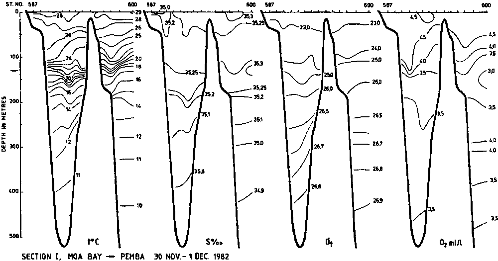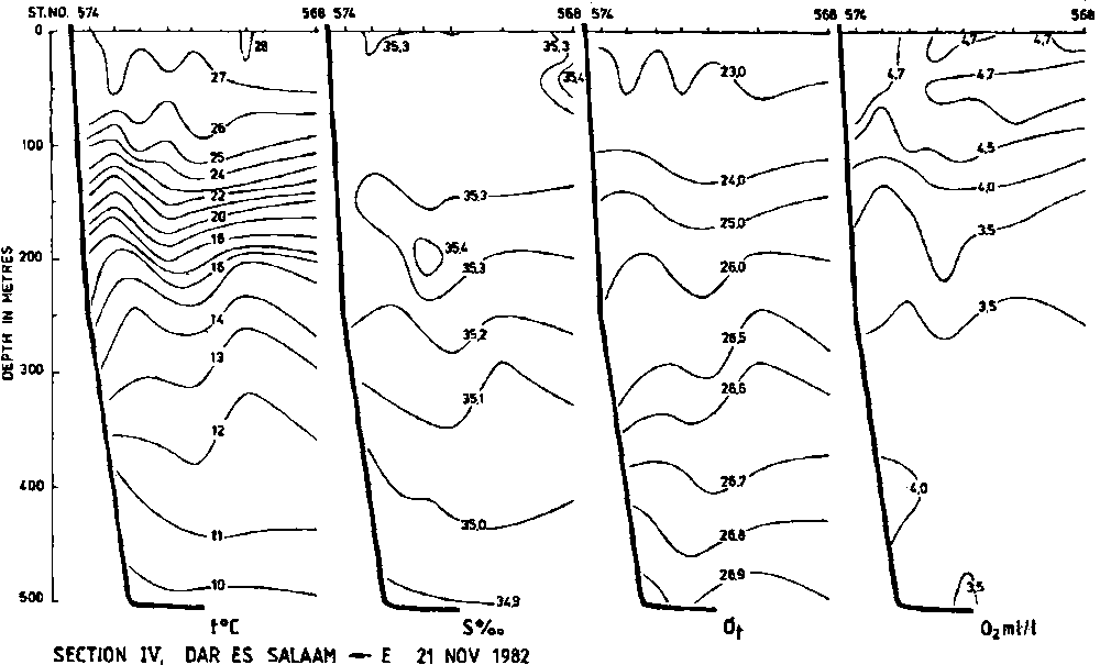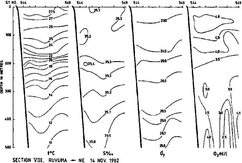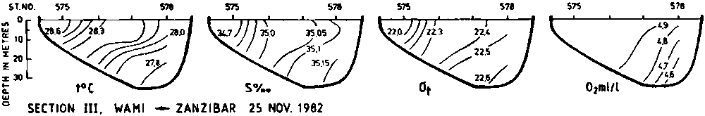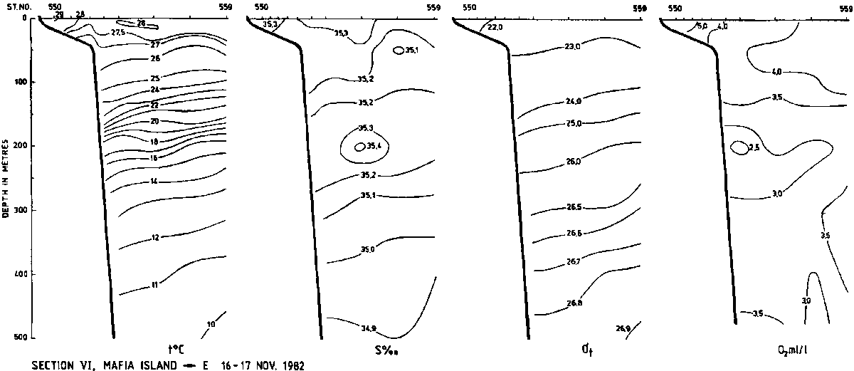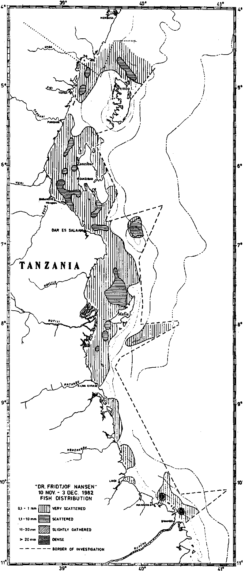 Some surface schools were observed by eye in the Mafia region, the Zanzibar Channel, along the east coast of Zanzibar, and quite many in the shallow area northeast of Tanga.