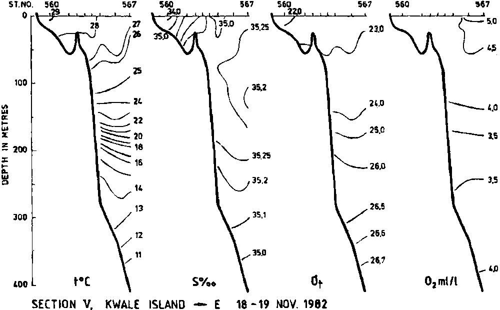 The general tendency was that the surface layer was about 1-2°C warmer and the thermocline was not as distinct as in June-July. The salinity in the upper layer was also higher (0.1 - 0.2 ). The oxygen content was similar for the sections I-VI (Figs. 3-8) as observed in June-July, but for sections VII and VIII (Figs. 9, 10) the oxygen content was up to 2 ml/I higher this time. An oxygen minimum (2.5 ml/1) was observed at 200 m in section IV (Fig. 6) in June-July; now this minimum was 3.5 ml/I. The oxygen content for the water column 5-500 m was above 2.4 ml/1. The oxygen content observed in this water column has probably no limiting effect on the fish distribution.