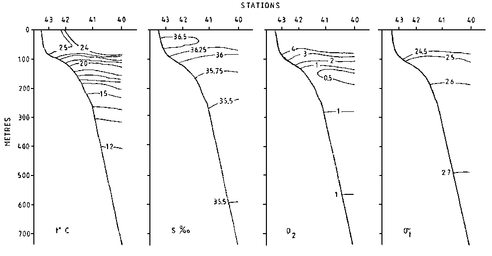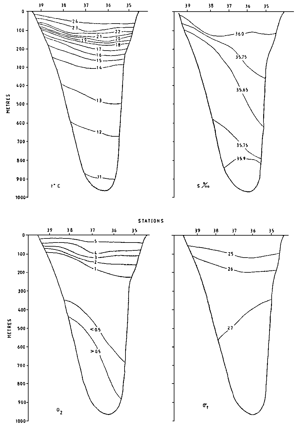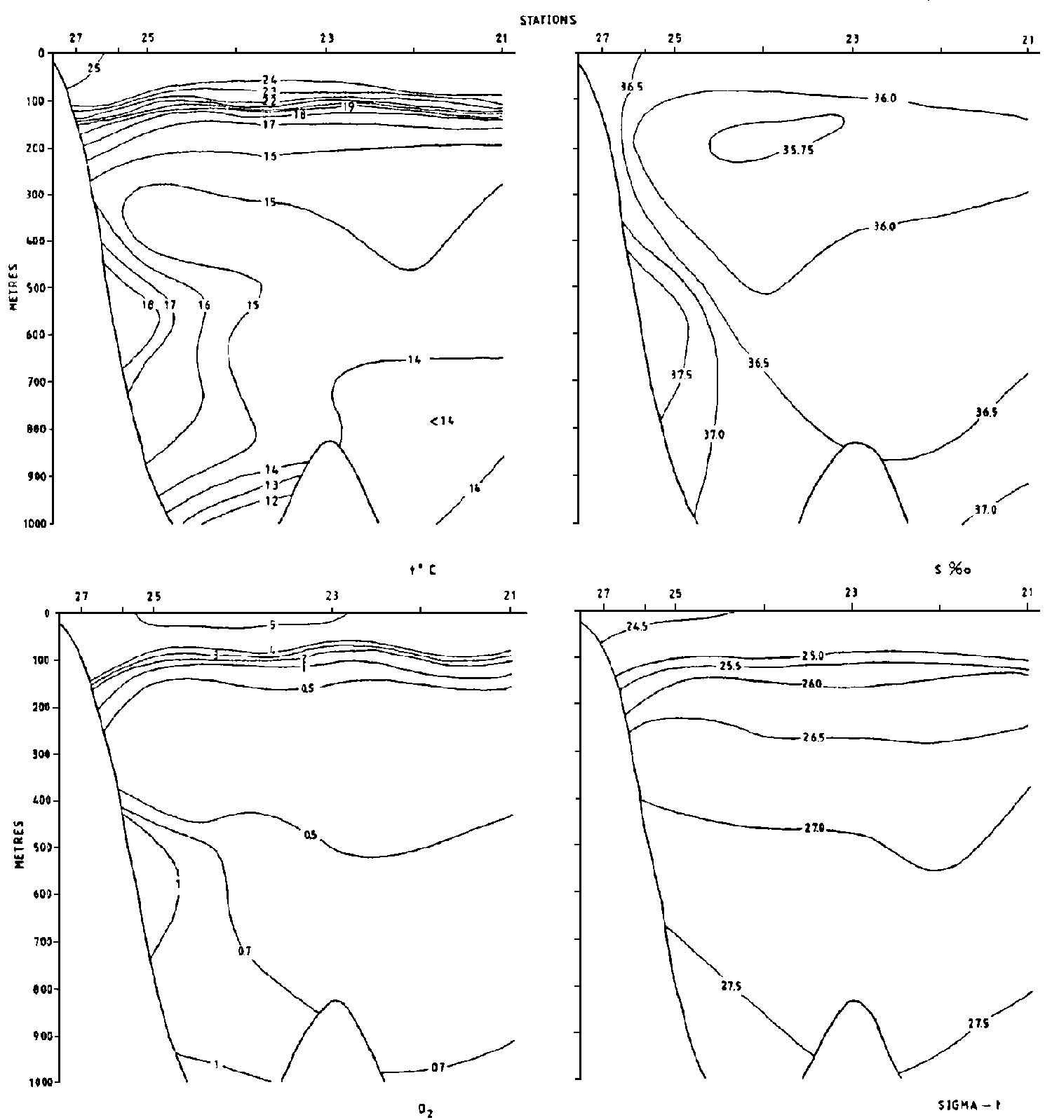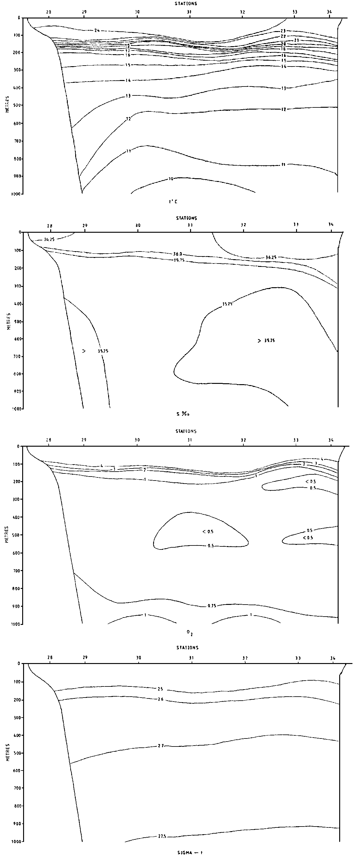 Hydrography was observed in two sections, one off the southern and one off the northern part of the coast. These sections are shown in Figs 4.2 and 4.3 respectively. Only temperature and dissolved oxygen content could be presented since salinometer tables for salinities above 39 units were not available onboard the ship.