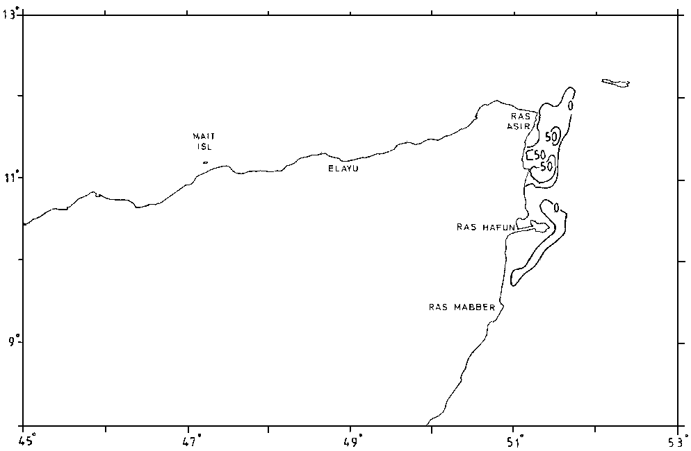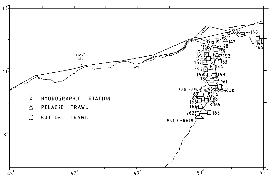Along the coast of Ethiopia the bottom is extremely rough and uneven. Trawl stations were, therefore, located according to the bottom conditions more than according to the acoustic fish recordings. On the narrow shelf along the northern part of the coast, bottom conditions did not allow operation of the bottom trawl.