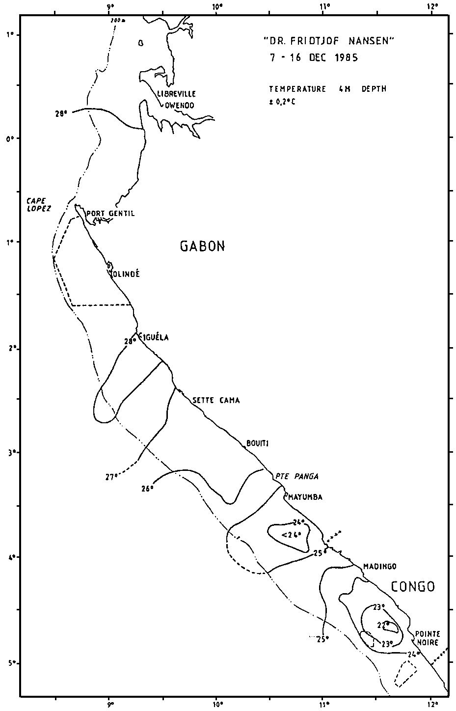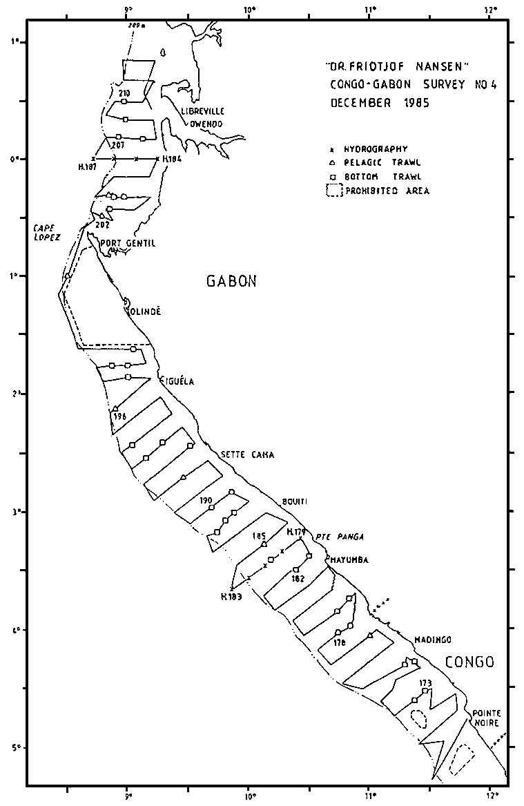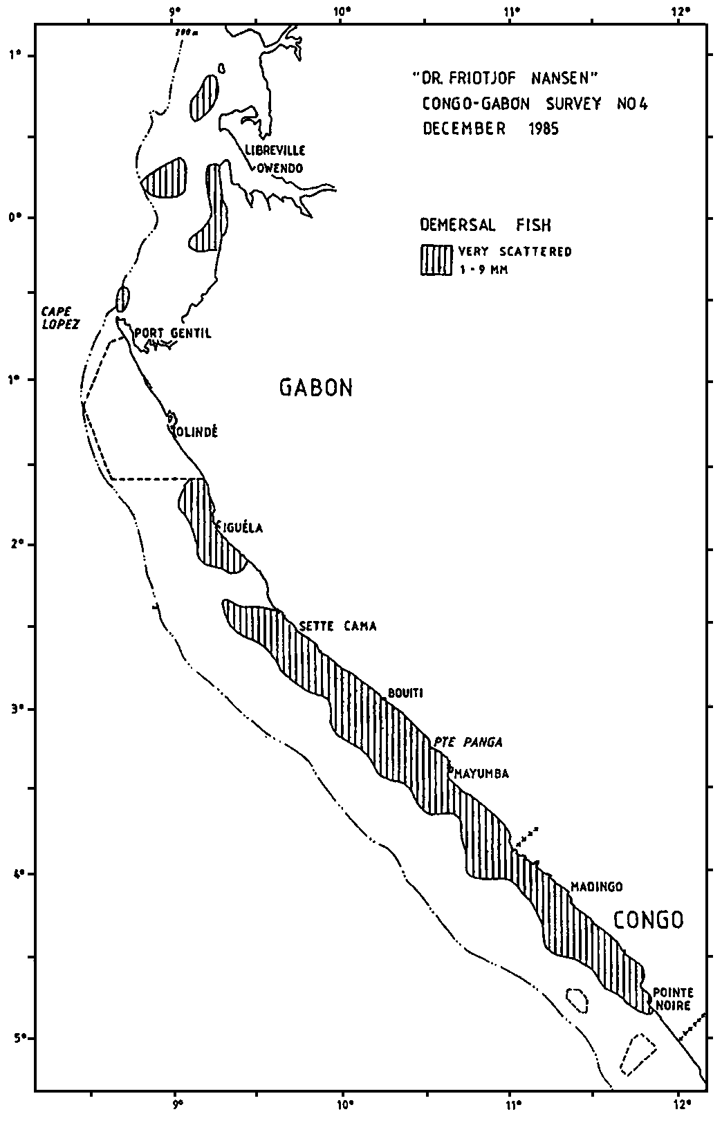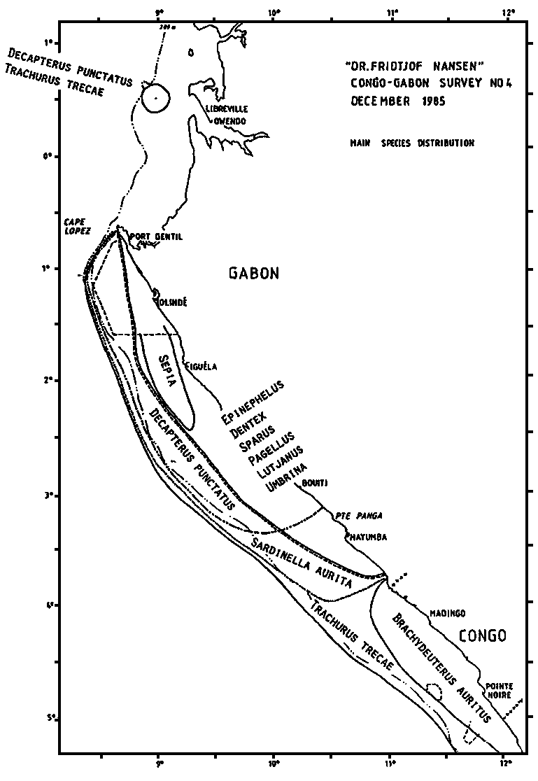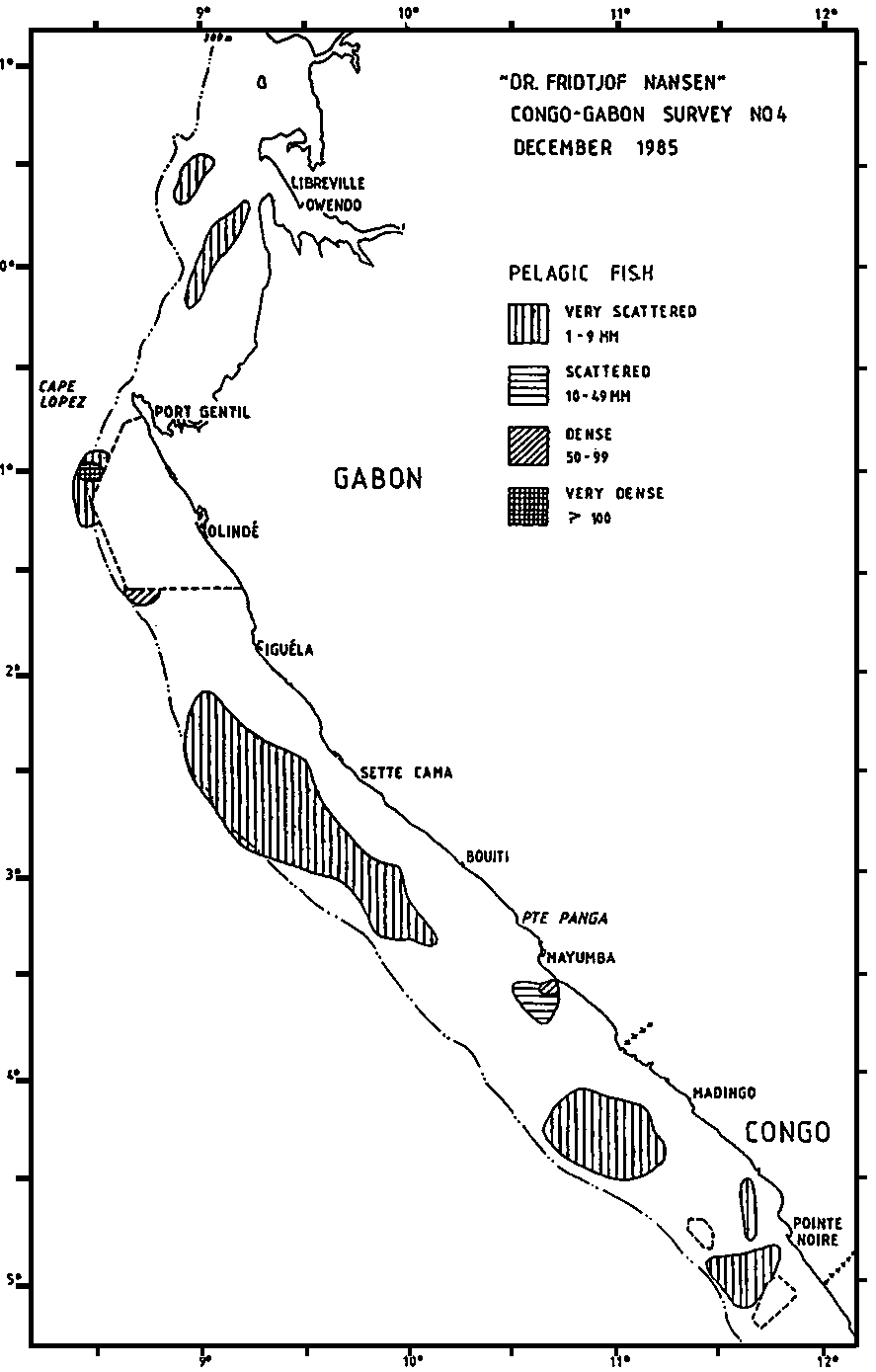 The distribution of the small pelagic resources is shown in Figure 4. The level of pelagic fish has dropped considerably since the previous survey (September). These resources seem to be back to the state of the first coverage in March. As earlier the pelagic fish consists of young stages of Trachurus trecae (10 & 17 cm mod.1.), Sardinella aurita (13 & 19 cm mod.1.). Decapterus punctatus (9 & 18 cm mod.1.) and some Engraulis encrasicholus (11 cm mod.1.). The triggerfish, Balistes capriscus, did not form noticeable parts of the pelagic resources during the last survey. The biomass is estimated to 55 thousand tonnes. The estimate from the first survey was 100 thousand tonnes, of which 52 thousand tonnes were triggerfish. The two estimates on other pelagics are thus in close agreement. A regettably weak element in the investigations is the non-covered oil-drilling area south of Cape Lopes, which might hold significant resources. Part of the variations in the resources can be due to seasonal migrations in and out of this area. As permission to operate in this area was not received, it had to be omitted from the investigations.