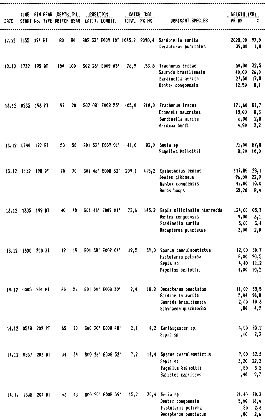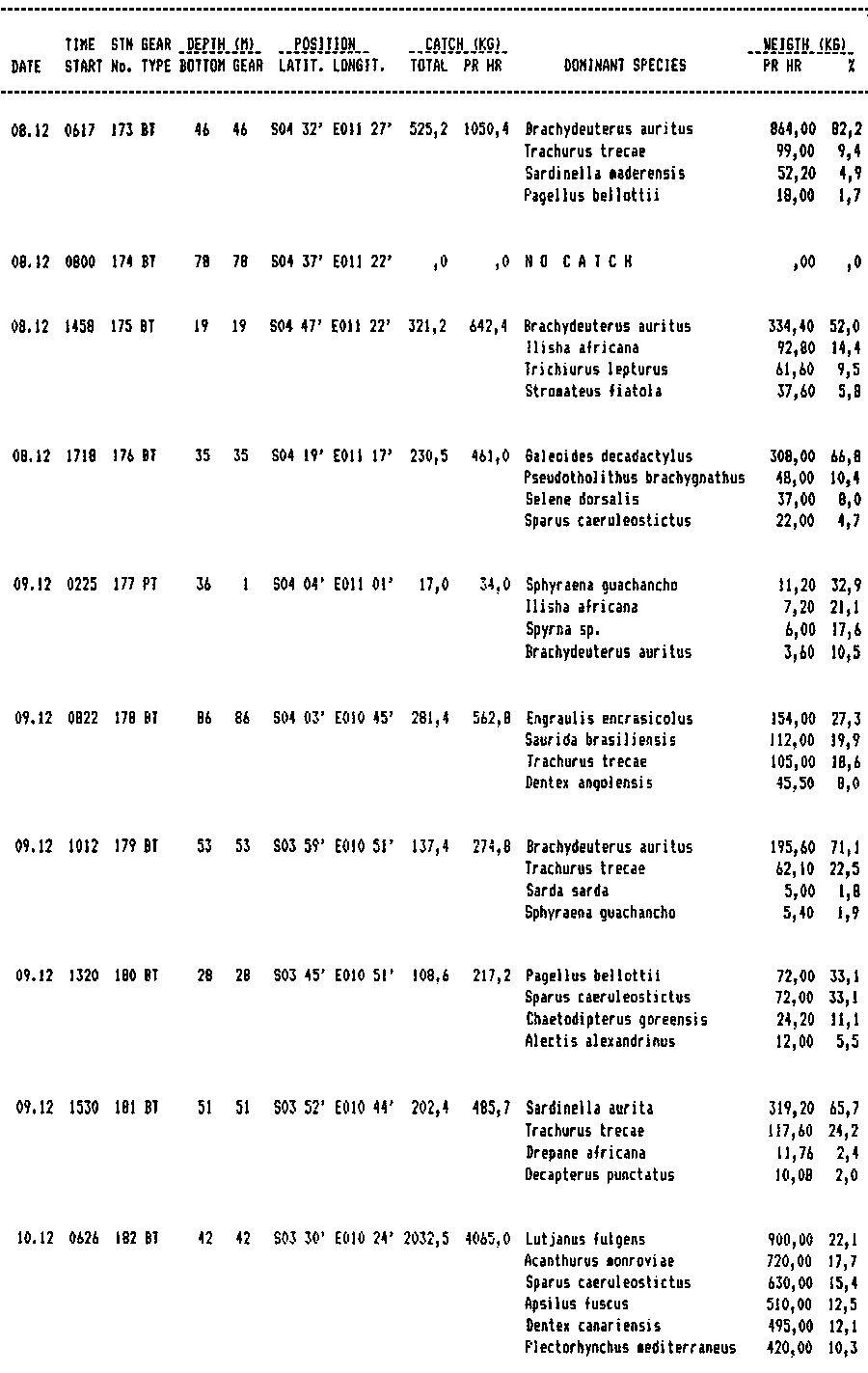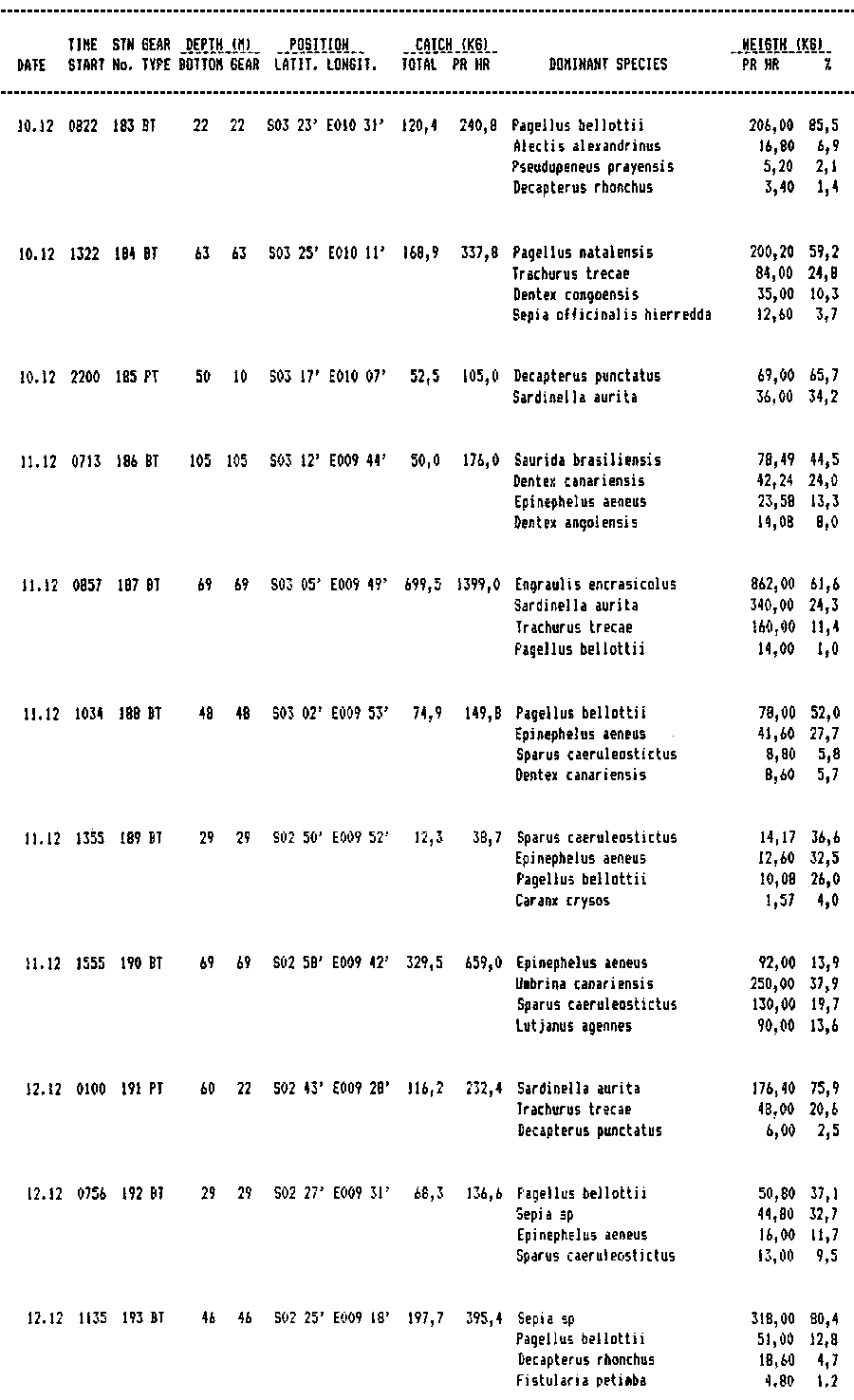 APPENDIX II - RECORD OF FISHING STATIONS WITH DOMINANT SPECIES.