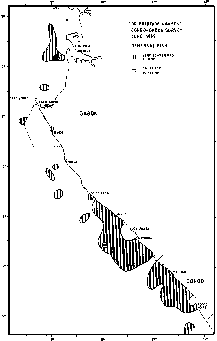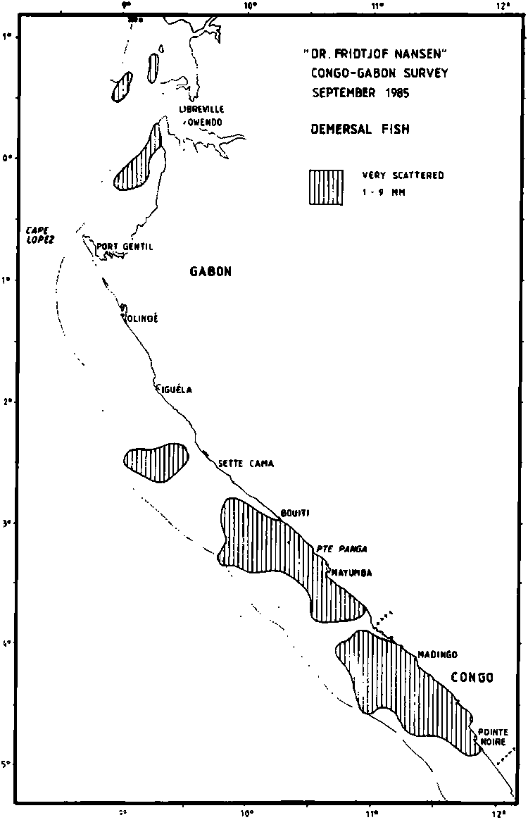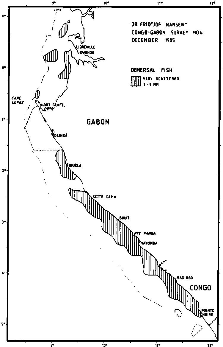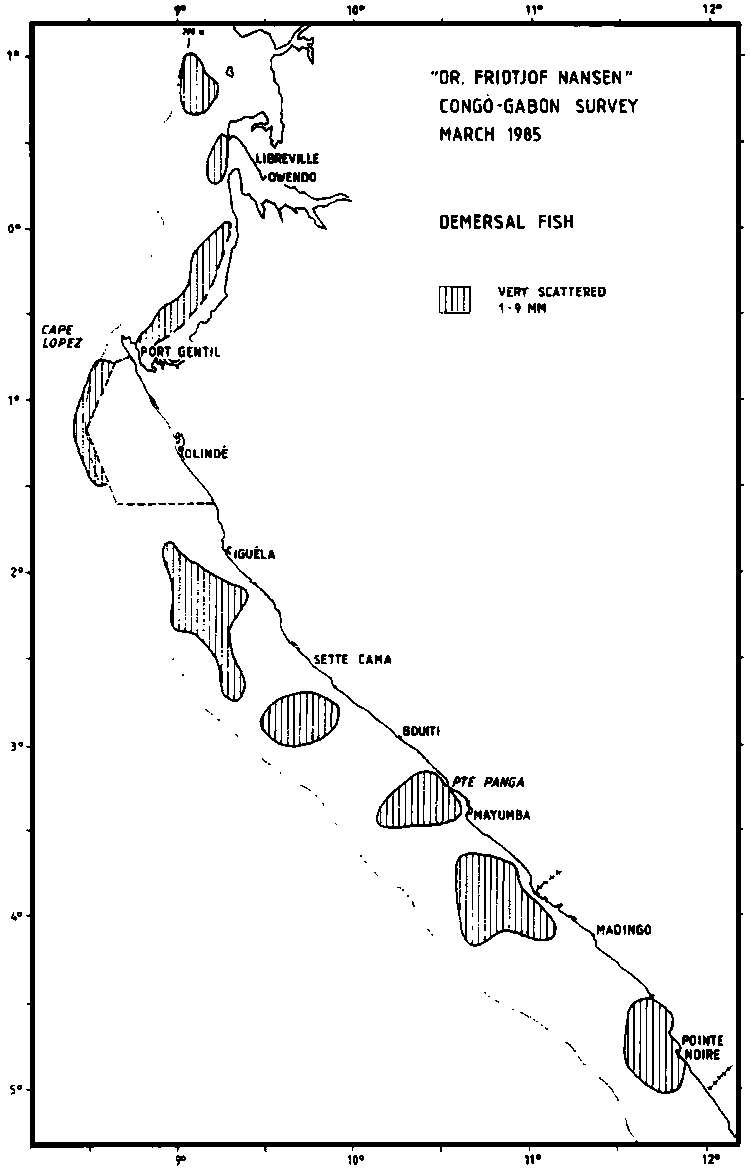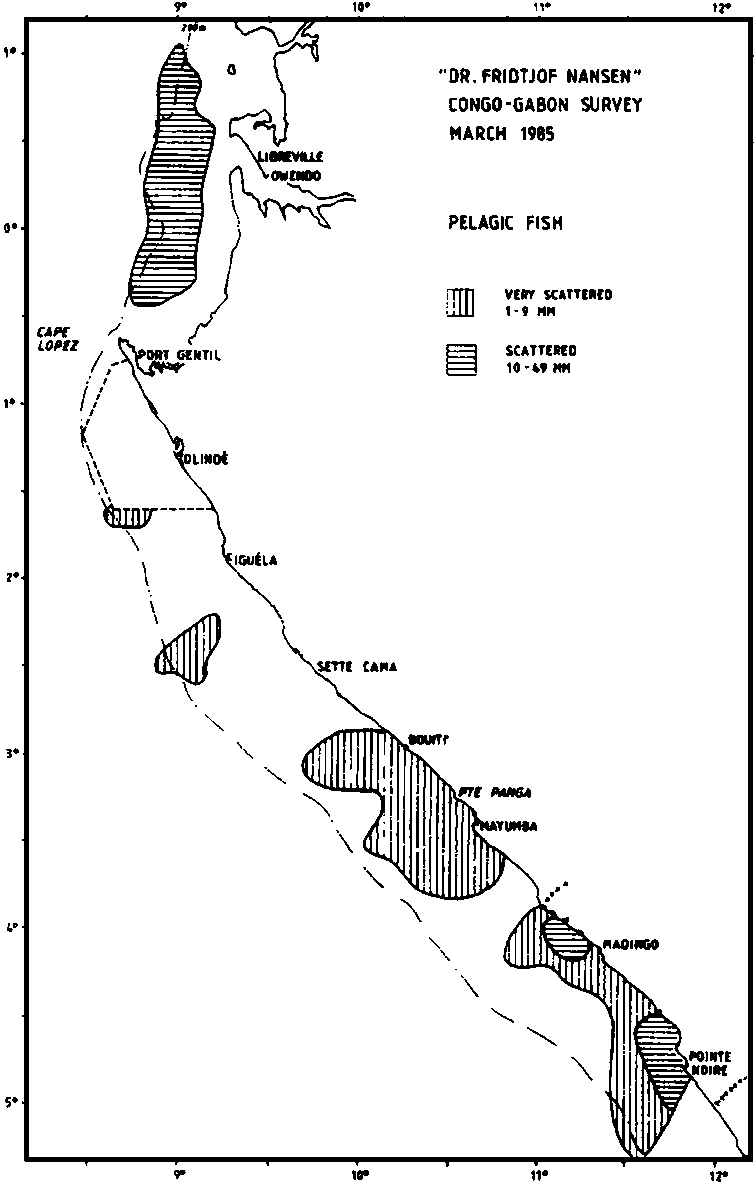 Survey 1, 2-15 March 1985As mentioned in Chapter 1 above the special oil drilling area south of Cape Lopez had to be omitted from the investigations since permission to operate there was not obtained. This detracts somewhat from the value of the survey. For the abundance estimates attempts have, however, been made to make adjustments for this omission by assuming that the closed area holds the same densities of fish as those found in the adjacent area.