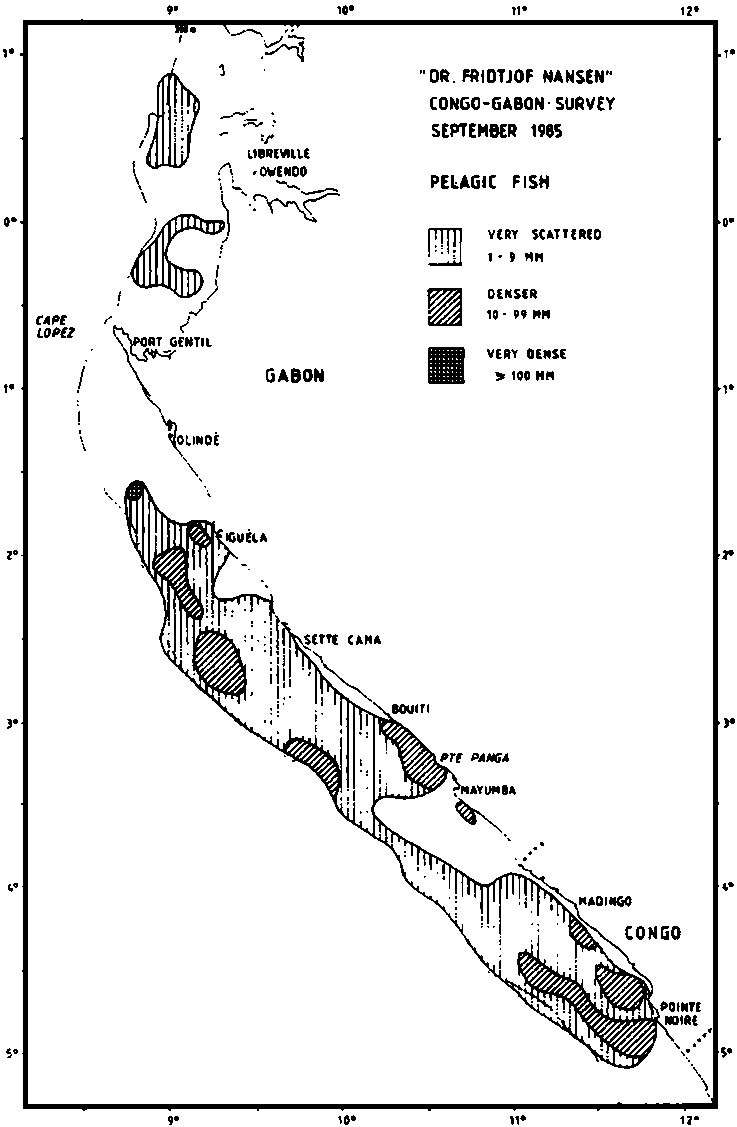 Figure 7 shows the distribution of pelagic fish as observed with the acoustic integration system for each of the surveys. The coverage off Congo has been included since the observations made there may help to demonstrate the migrational pattern of part of the resources.