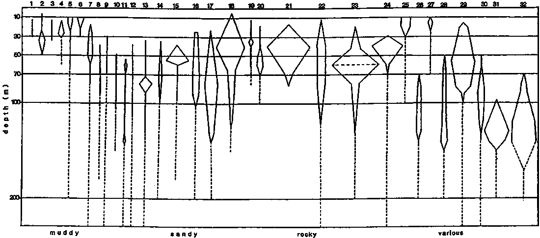 The shallow-water fish communities can be classified according to their bottom preference. Some species have a higher affinity for muddy/soft bottoms such as Pseudotolithus typus, Galeoides decadactylus, Pteroscion peli and Pseudupeneus prayensis, among those fished by Dr. F. Nansen. Species of Ariidae and Mugilidae are also very important components of these community, but they are mostly found in those shallow waters not accessible to the vessel. Mustelus mustelus, Raja miraletus and Torpedo torpedo are the representatives for sharks and rays within this assemblage. Penaeus notialis has also been included in this category, north of Cape Lopez only. Pseudotolithus senegalensis, although often very abundant over muddy bottoms, is actually reported on various types of bottoms and for this reason it has been included in the right part of the illustration, under various. Another group of shallow-water species has a clear preference for sandy and/or rocky bottoms. Among these Sparus caeruleostictus, Epinephelus aeneus, Lutjanus agennes and L. fulgens and Apsilus fuscus. Some of these species were caught at highest rates between 30 and 50 meters. More ubiquitous species are Pagellus bellottii and Pomadasys jubelini.