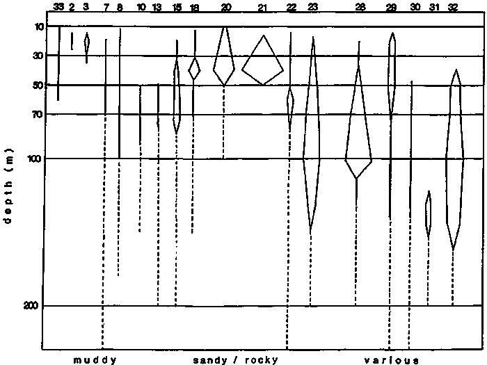 1. Arius speciesFig 3 b. Abundance repartition of the main demersal species in relation to depth, obtained from catch rates in bottom trawl. Broken lines extend the depth distribution of each species to its known range. b) north of Cape Lopez