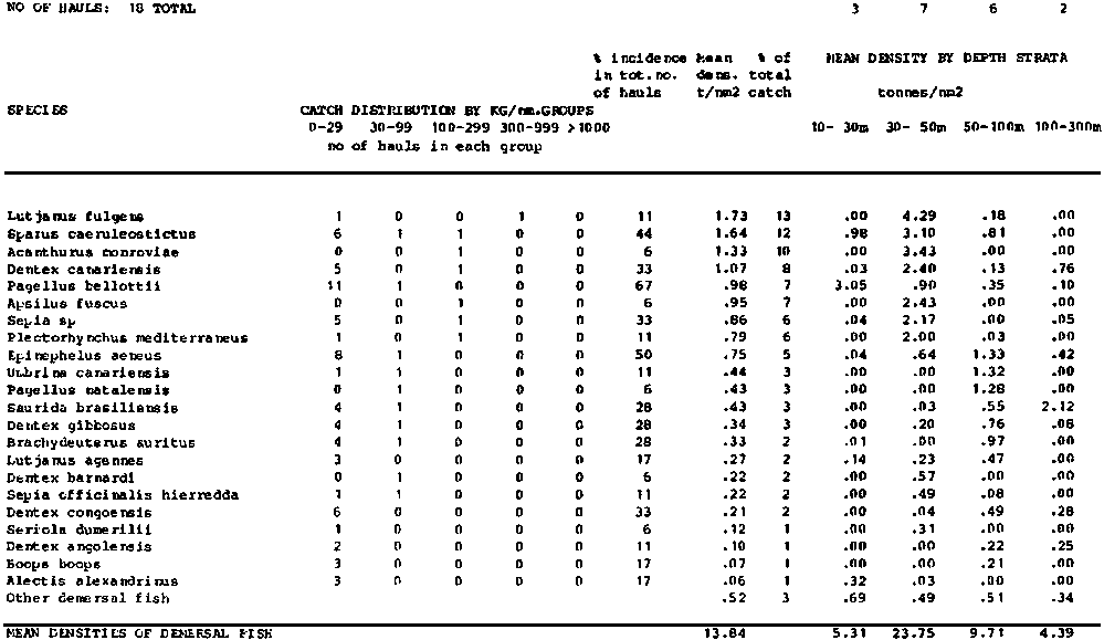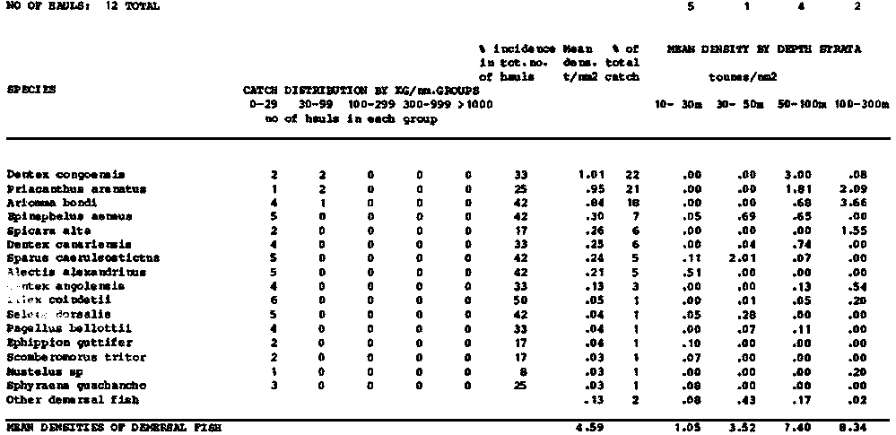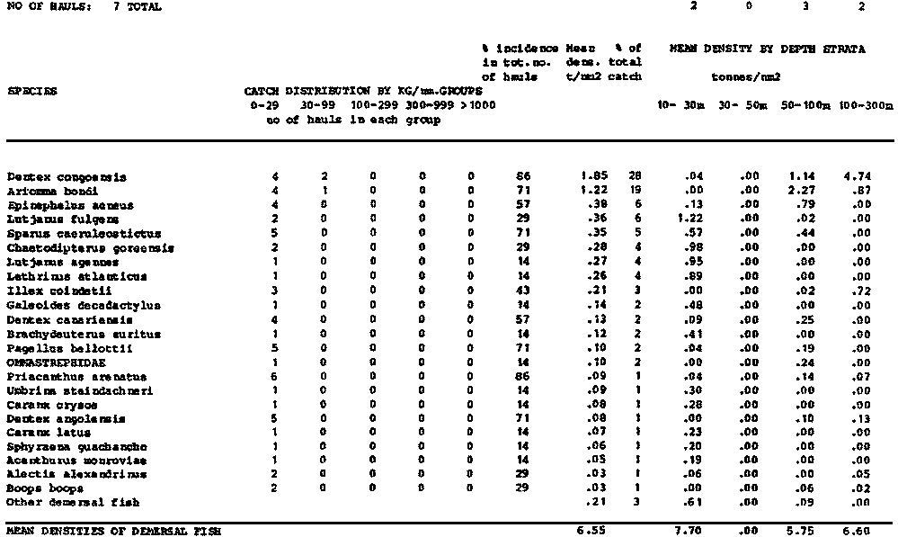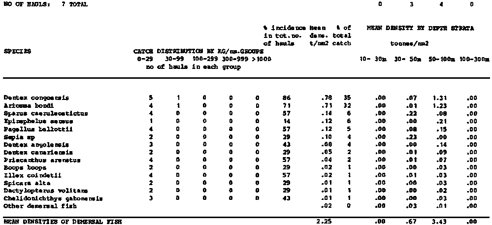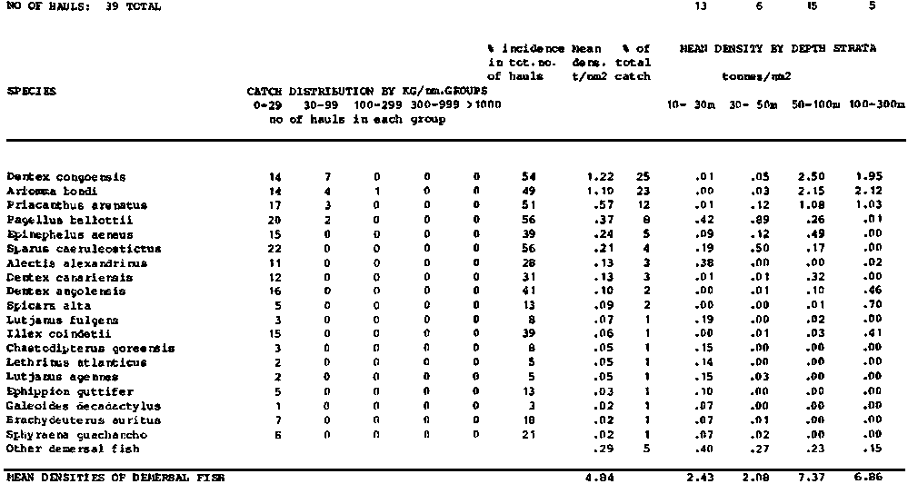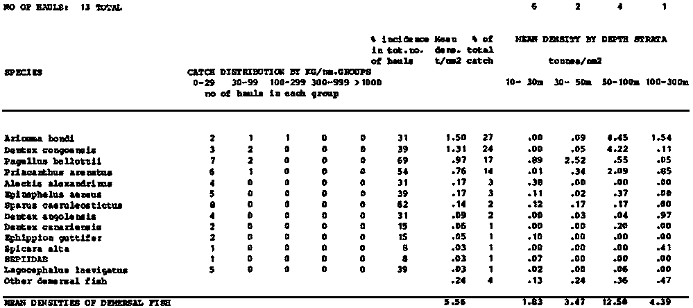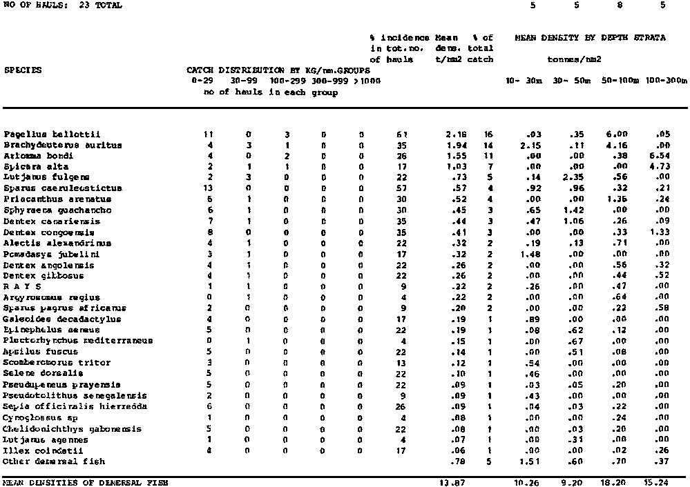 Annex 8. Summary tables of swept area trawl data showing catch distributions and mean densities by species, surveys, regions and totals.