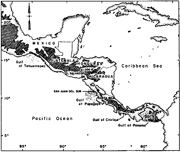 Table 2.1 shows approximate estimates of the coastlines and the extents of the continental shelf within depth ranges for the Pacific coasts of Colombia, Panama, Costa Rica, Nicaragua, Honduras, El Salvador and Guatemala, and for the Gulf of Tehuantepec in Mexico. Panama has with abt. 15000 nm2 the largest shelf, the most important part of which is contained within the Gulf of Panama. For the other countries the areas range from abt 6 000 to abt. 10 000 nm2 except for Honduras whose Pacific coast is limited to a part of the small Gulf of Fonseca.