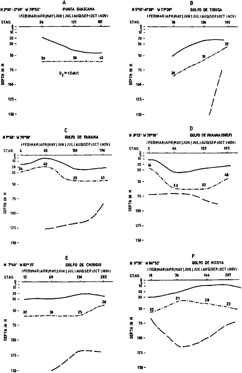 In spite of a fairly broad shelf in the Gulf of Chiriqui oxygen deficient water is not found in the inner part. The variation of the hydrographical properties is here similar to that on the edge (Fig. 2.1.2.E), probably due to a broad current covering the total shelf. Oxygen less than 1.0 ml/l at 125 m of depth is observed only once.