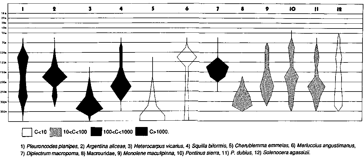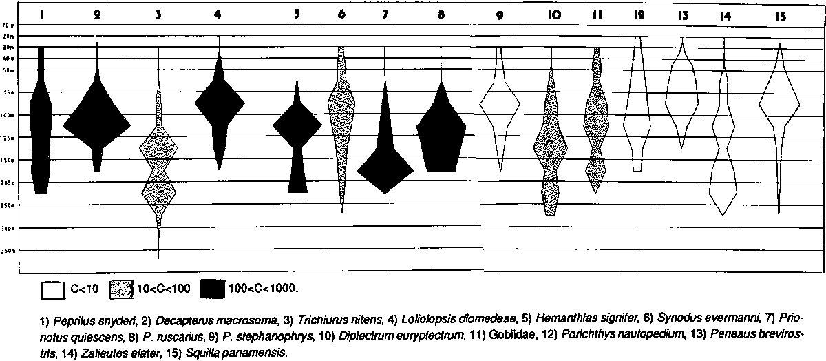 Some of the species found in this group have a semi-pelagic or bentho-pelagic nature, i.e. able carry out important vertical migrations. Although they are not typical demersal species and have a wide depth distribution range, they have been included in this section because they formed the greatest part of the biomass in this depth stratum. The most abundant were the Pacific butterfish, Peprilus snyderi/medius, the Pacific cutlassfish, Trichiurus nitens and the dart squid Loliopsis diomedae. These species form aggregations close to the bottom during daytime and are dispersed in the water column at night. They are found from shallow inshore waters to depths over 200 m, throughout the year. Captures of cutlassfish ranged from 11 to almost 400 m depth, but the bulk of the biomass was between 150 and 200 m throughout the year. The dart squid is shallower, with highest concentrations between 75 and 100 m.
