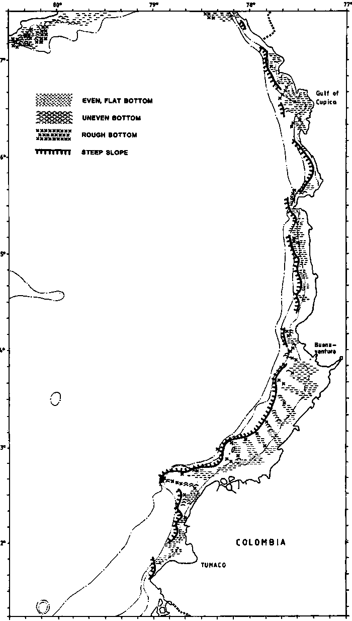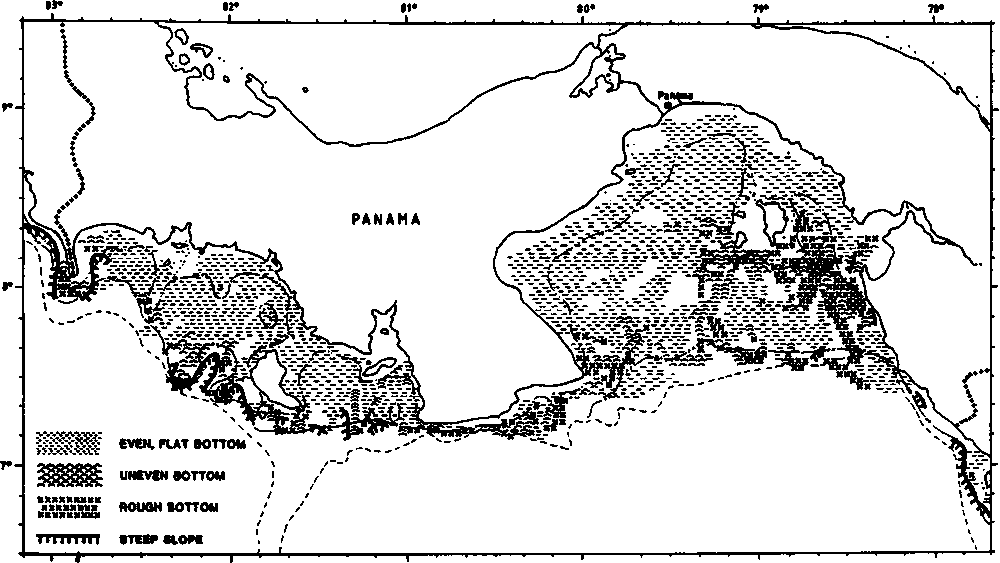 Figure 2.3.1 shows the data on bottom character deriving from plots along the course lines and some interpolation. The Colombian shelf is narrow, on average abt. 20 nm, but with wider parts from about Pta. Guascama to Buenaventura and in the Gulf of Cupica. In the south rough bottom prevails in the outer parts of the shelf and the slope is generally very steep. Larger areas of smooth bottom is found in and off the Gulf of Cupica. The major parts of the wide Panaman shelf is smooth and even, but some stretches of uneven and rough ground is found south of the Pearl Islands, in the southeastern part of the Gulf of Panama and west of Coiba Island. Also the Costa Rican shelf has generally smooth and even bottom, but with some rough parts off Pta. Judas and Cabo Blanco. Off Nicaragua most of the shelf is trawlable, but the slope is very steep in some parts especially in the south and in the narrow canyon leading towards the Gulf of Fonseca. A similar description can be made for El Salvadors shelf, but conditions along the slope are somewhat more difficult, with more very steep and rough bottoms, unsuitable for trawling. Most of the Guatemalan shelf has smooth even bottom, except for some of the deeper offshore parts off Champerico. The shelf in the Gulf of Tehuantepec is very wide, 40-70 nm, with an outer part, about 1/3 of the total forming a platform with depths down to 300 m. Most of this wide shelf is even and smooth, but with some steep parts offshore in the southeast and northwest.