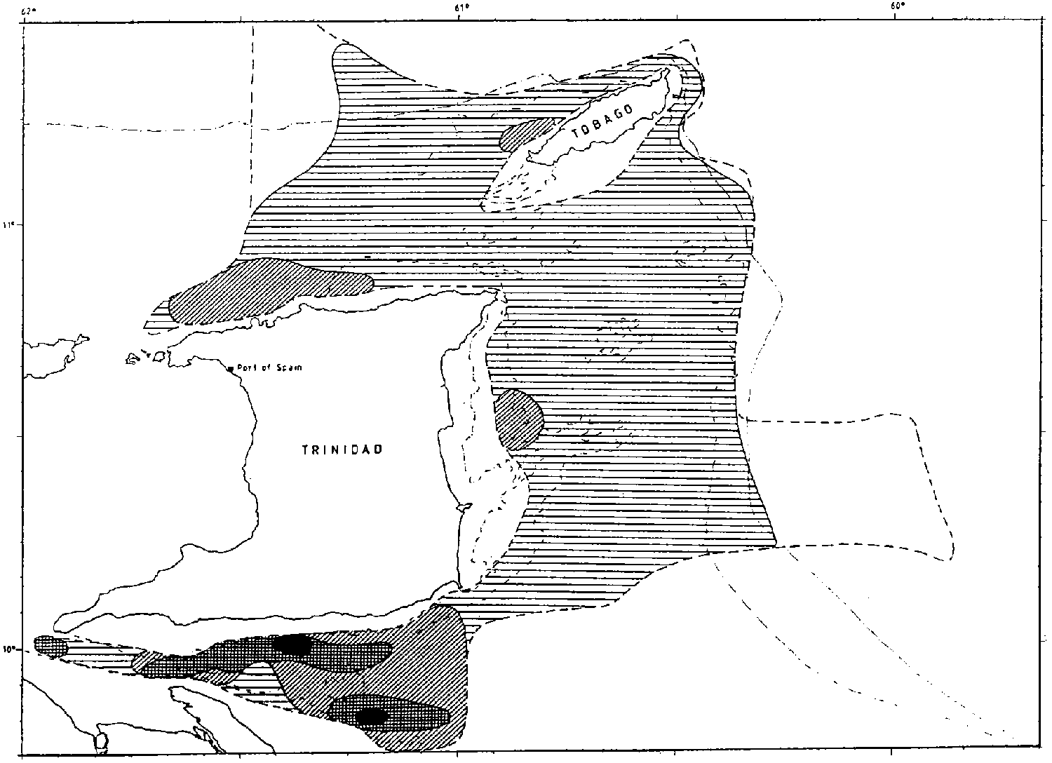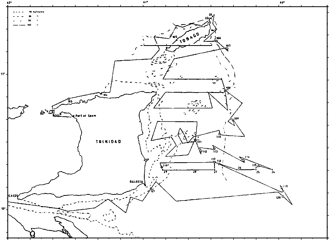 The objectives pursued in Trinidad & Tobago waters varied between the surveys. The north coast shelf was surveyed twice, in May and November. The east coast shelf was covered in all four surveys, but with different objectives and varying survey effort. The Joint Fishing Zone was surveyed in May, August and November. The number of fishing experiments by surveys and areas were: