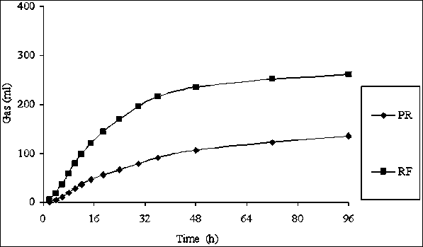 This study suggests that the Reading Pressure Technique was able to handle a very wide range of tropical substrates and shows good potential as a technique to rapidly screen diverse feedstuffs in terms of OMD, cumulative gas production profiles and gas production parameters. In the case of fodder plants, the complex relations and interactions between the components of the substrate and the microbial population made difficult a statistically significant fit. This was not the case of the by-products that are more homogenous feedstuffs. This work indicated the need for a better mathematical model to describe the in vitro fermentation.
