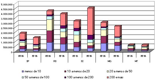 In the future, the expansion of the poultry production will be mostly based on larger farms located closer to the regions that produce soybean and maize. The evolution of the estimated quantity of chicken in Brazil per stratum of flock size between 1985 and 1995/96 shows that most of the growth is observed in the larger farms and the size of the chicken flock did not grow much in the strata of flocks smaller than 10 thousand chickens.