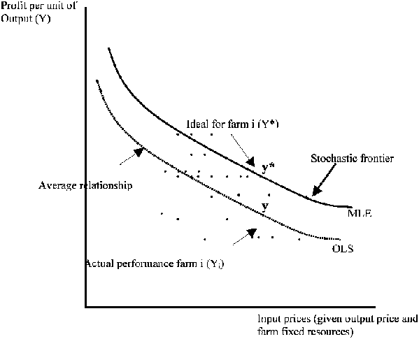 The actual performance of each farm in terms of unit profit can then be compared to an ideal unit profit for that farm, taking into account its resources and prevailing input prices. The difference between the ideal and the actual profit per unit for that farm is the farm's relative profit inefficiency. Following Ali and Flynn (1989), Figure 3.1 traces a profit frontier for a sample of farms: each dot corresponds to the actual outcome in terms of profit per unit of output for a specific farm relative to input prices; points on the stochastic frontier curve (estimated by maximum likelihood methods and labeled MLE. Maximum Likelihood Estimation) represent fully efficient farms (on the frontier); and all points below the stochastic frontier curve represent inefficient farms in terms of their specific resources at prevailing input prices