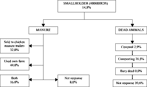 Table 6.44 shows that both small and large poultry farmers tend to use the manure on the farm or sell it. A lower proportion would use both strategies. In addition it is apparent that small farmers tend to use a larger fraction of the manure on the farm, the opposite happening with the large farmers.