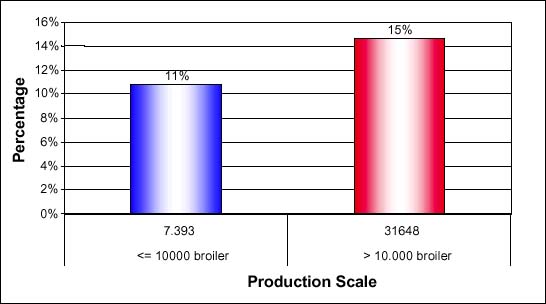 In the broiler case, the results show that the efficiency does not depend on scale, but is higher in the South region if compared to the other. Also, statistics differences between small and large producers were not observed for layer.
