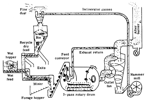 4. Diagram of the dehydrator pictured above. Dry material is recycled and blended with wet material to obtain a mixture with crumbly physical properties for efficient dehydration.