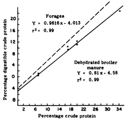 The apparent digestibility of crude protein by ruminants increases with crude protein content in concentrates, forage, or mixed rations (Blaxter and Mitchell, 1948; Dijkstra, 1966). This high correlation (r = 0.96 to 0.99) has been used to predict digestible protein from crude protein content. “True” digestibility of crude protein is estimated by the slope of the regression of digestible crude protein (Y) on crude protein content (X) in dry matter. Figure 5 shows the results of feeding rations containing 19 to 100 percent dehydrated broiler excreta to sheep. Other low-nitrogen ingredients in the rations were molasses, solka floc (cellulose) and maize starch. “True” digestibility of crude protein in dehydrated broiler excreta was estimated to be 81 percent, compared with 96 percent for fresh forages. However, estimates from other data in the literature were similar to those estimated for conventional feeds (Smith, 1973). The relatively high “true” digestibility estimates for crude protein in dehydrated poultry excreta could result in misinterpretation of its use as a nitrogen source for ruminants, due to its high nonprotein nitrogen (NPN) content. Most of this NPN is uric acid nitrogen, which could have a theoretical or “true” digestibility of 100 percent, similar to urea nitrogen in this system. Because the “true” digestibility of nitrogen from poultry excreta implies nothing of its efficiency of use for productive funcitons, supporting nitrogen utilization data are necessary for a more critical evaluation of this product. Uric acid was evaluated as a source of dietary nitrogen in purified diets of steers and found to compare favourably with other NPN sources (Oltjen et al., 1968). Nitrogen from poultry excreta was retained and used for growth (El Sabban et al., 1970; Tinnimit et al., 1972; Smith et al., 1973).
