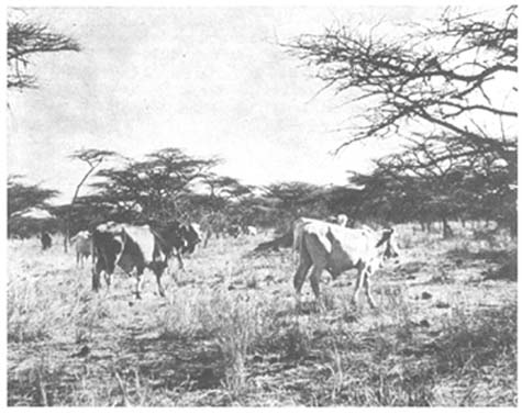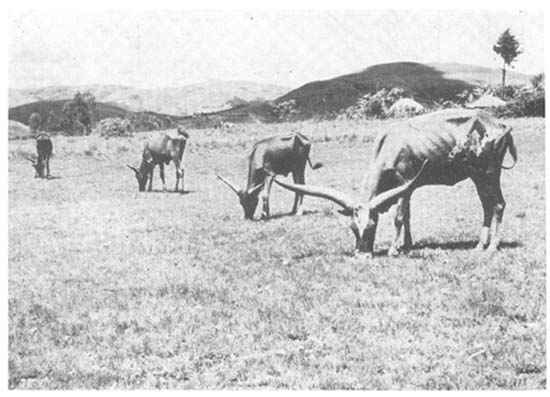 In this central African country the problem is how to avoid overgrazing, which precludes any improvement of the cattle industry. These Ankole cows start their productive life at about four years of age, and barely produce one calf every two years. A specialized fattening industry in areas of the country where better pastures exist would provide at least part of the solution.