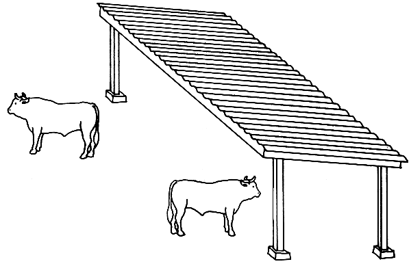 Protection from heat is of particular importance at certain times of the year in many of the developing countries. But this kind of protection does not justify a heavy outlay for installations — a simple shelter, it does not have to be waterproof but must offer shade during the sunniest part of the day — is, when well-designed, sufficient to ensure the comfort of the animals and proper air circulation. Even a row of trees or hedge, specially planted for this purpose, is sometimes enough.