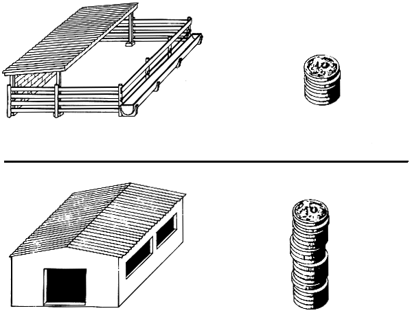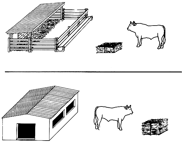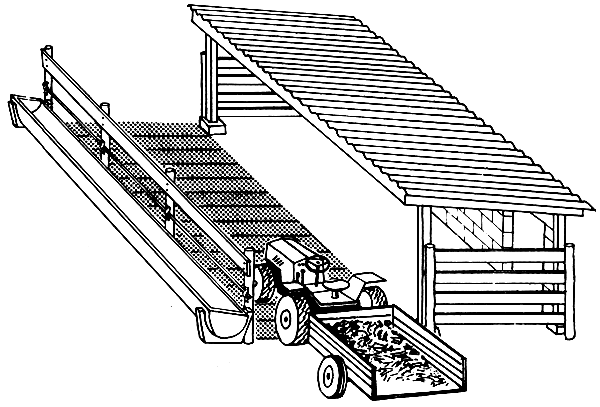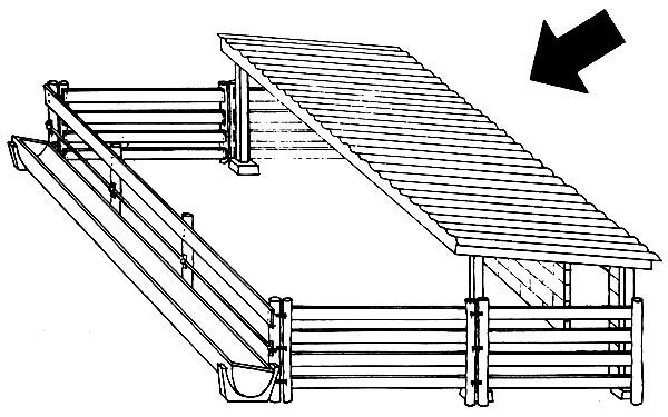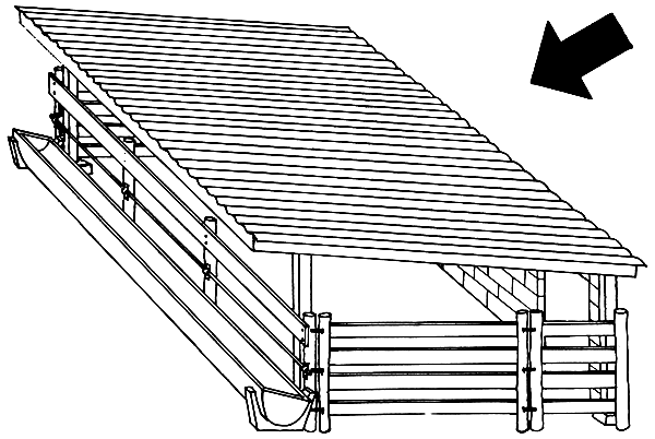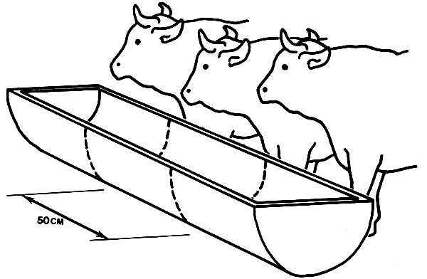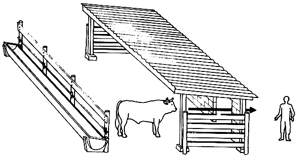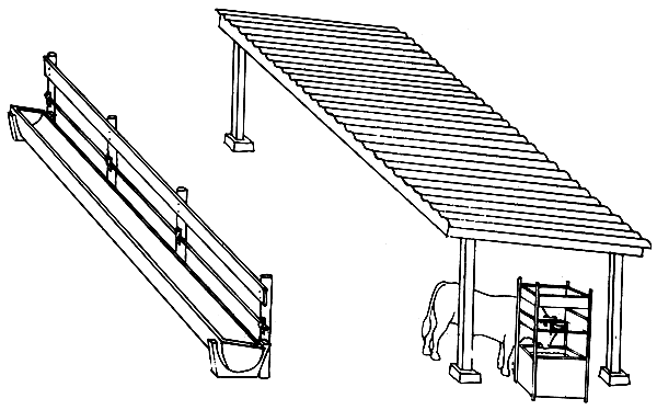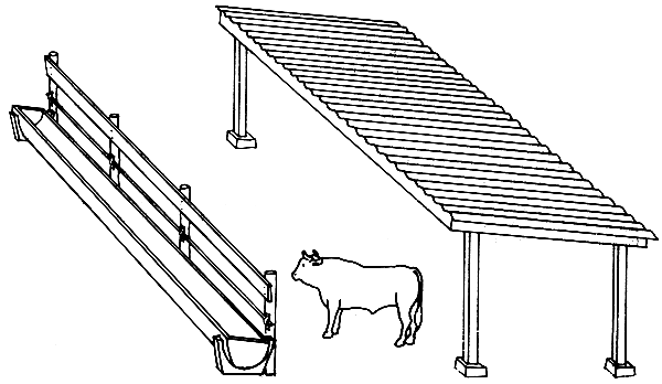 Some stockmen think to improve this system by building a shed roof 2–3 m wide over the manger, thinking to thus protect the feed from intemperate weather. In addition to the fact that this extra construction adds substantially to the cost of the installation, thus detracting largely from its advantageousness, the benefit is imaginary. Some of the stock will tend to group together under the shelter to get away from the sun and the rain and in so doing will prevent the others from eating. There is also little point in trying to protect concentrated feed, which is consumed in a few minutes. Nor does it seem necessary to protect the coarse fodders against sun and rain.