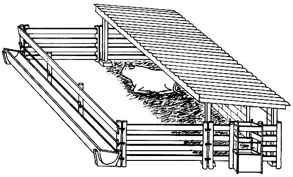 Lastly, stockmen are often tempted to modify the initial design of this kind of housing by building the manger under the covered section and not in the open part of the yard, thinking to thus protect the feed from bad weather as well as protecting the animals. This mistake, which consists of superimposing the feeding area (along the manger) on the resting area (under the roof), leads to the most harmful consequences. The animals lying under the shelter prevent the others from getting to the trough to feed. Not only that, the animals eliminate waste mostly when they feed, and so the roofed area of the yard soon becomes an impassable mire. And as has been mentioned, there is little point in protecting feed against sun and rain. So the covered part of the housing is to be set aside as a resting area for the stock.