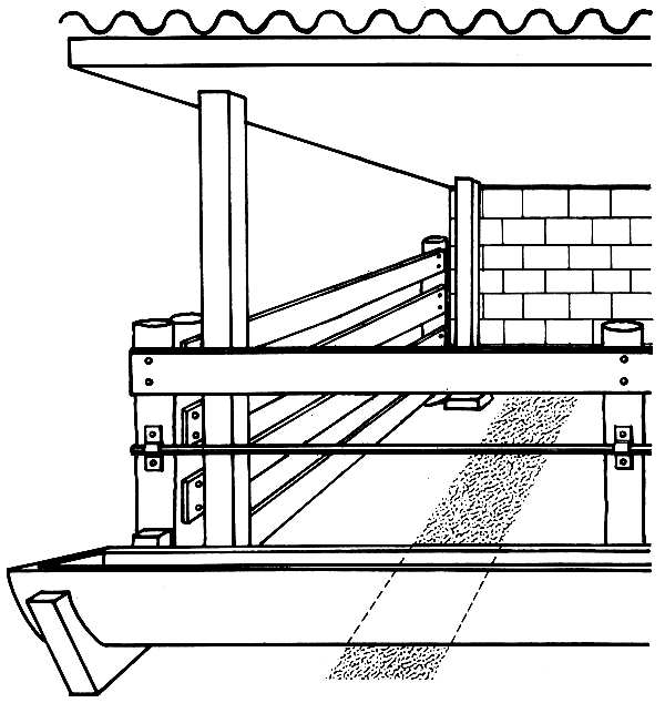 If the old building is closed on only three sides, such as a tool shed, it can be relatively easy to set up a fully roofed loose housing system if there is sufficient depth (± 5–6 m minimum). But there may be some problem with manure removal if entrance from the sides of the building is not possible. When the sides of the building are walled (whether three walls or four), then lightweight materials are called for when building the mangers so that they can be removed to let in a tractor and forklift to remove manure (see pps. 68–69). Removal by hand is difficult, though not inconceivable. Minimum height at the lowest part of the shed must be 2.5 m.