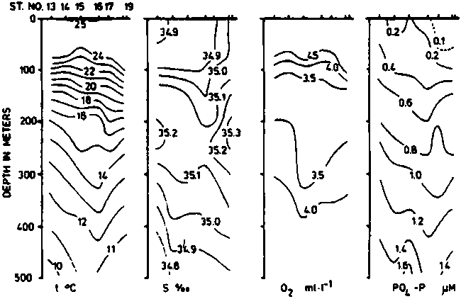 Fig. 86. ARIEL 1968. t°C, s, O2 ml/l and PO4 - PmM st. nos. 13-19.