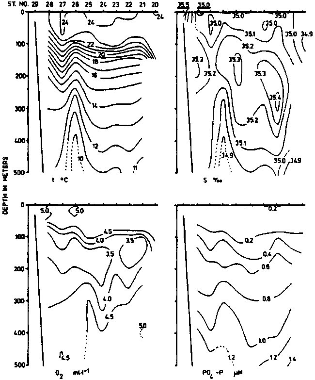 Fig. 87. ARIEL 1968. t°C, s, O2 ml/l and PO4 - PmM st. nos. 20-29.