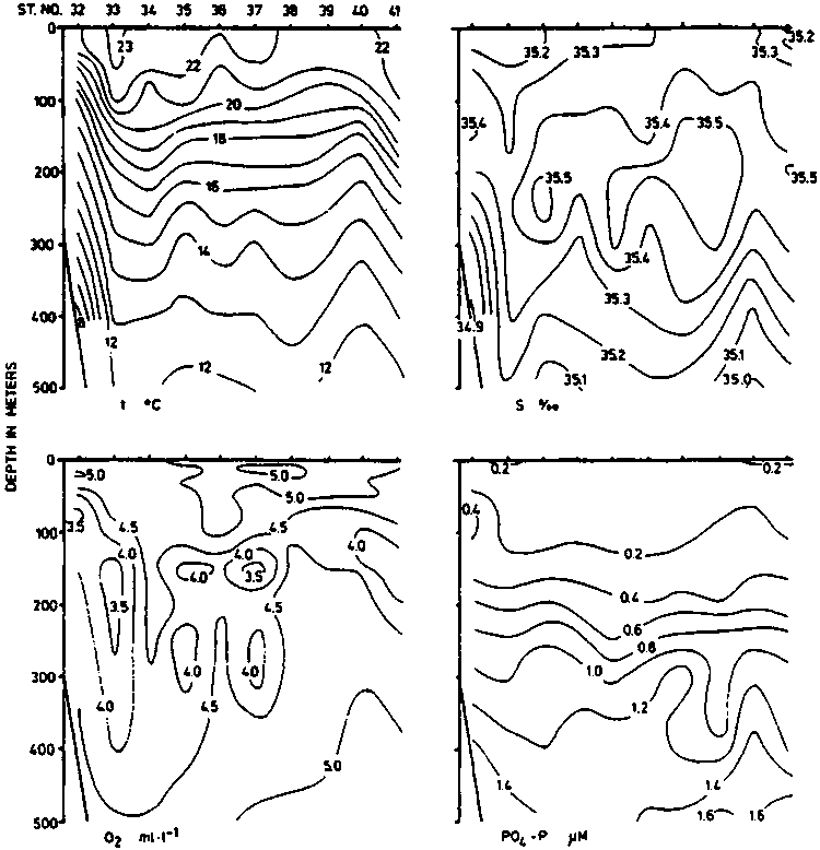 Fig. 88. ARIEL 1968. t°C, s, O2 ml/l and PO4 - PmM st. nos. 32-41.