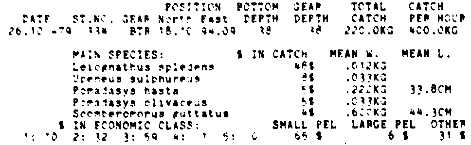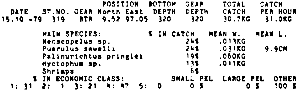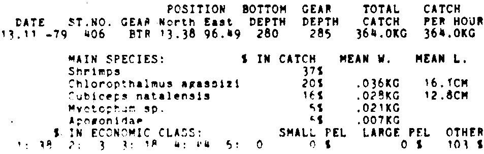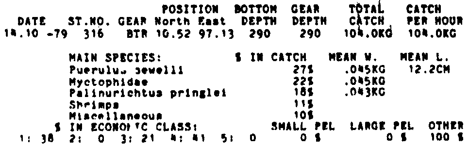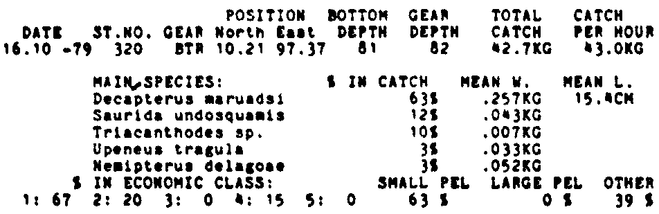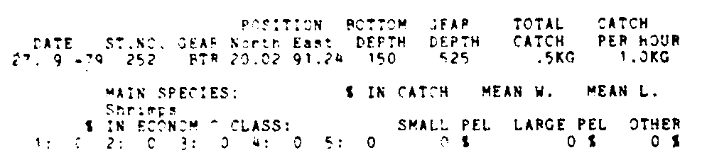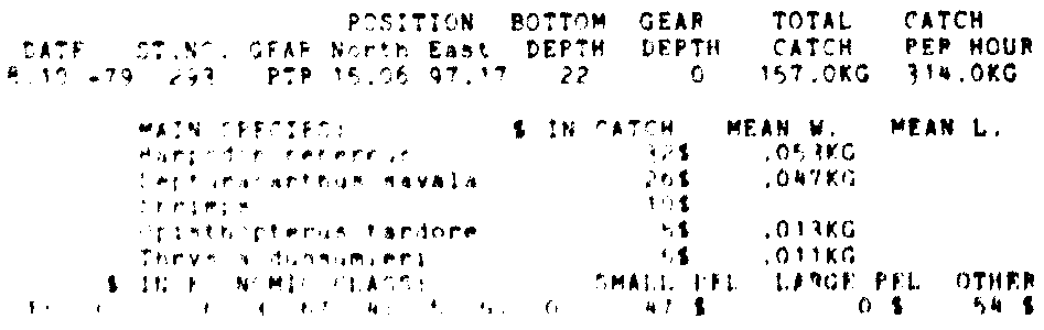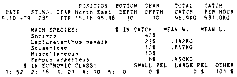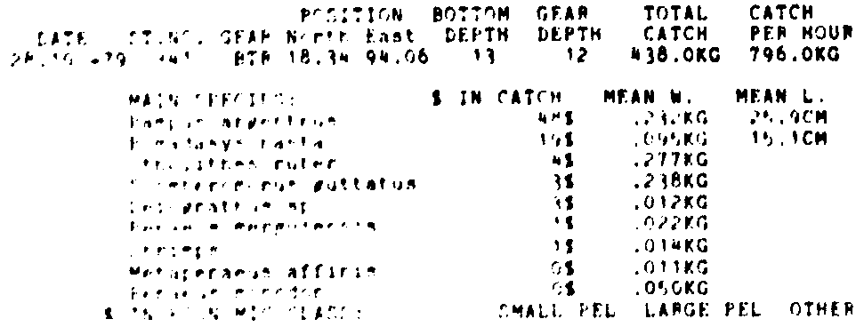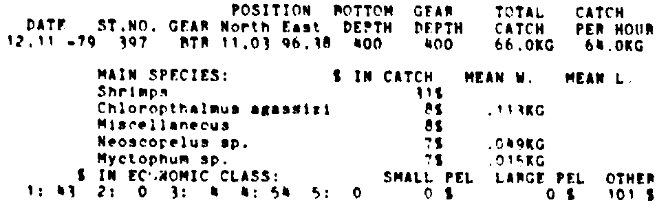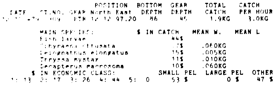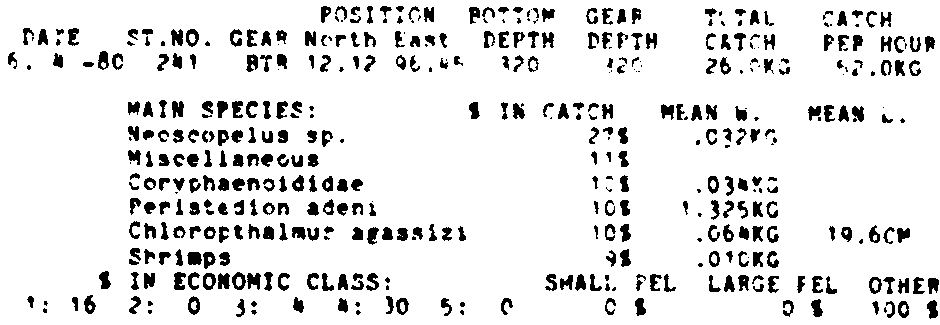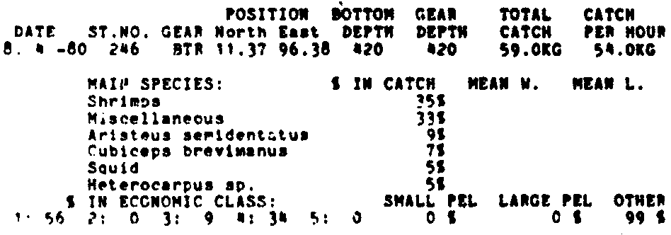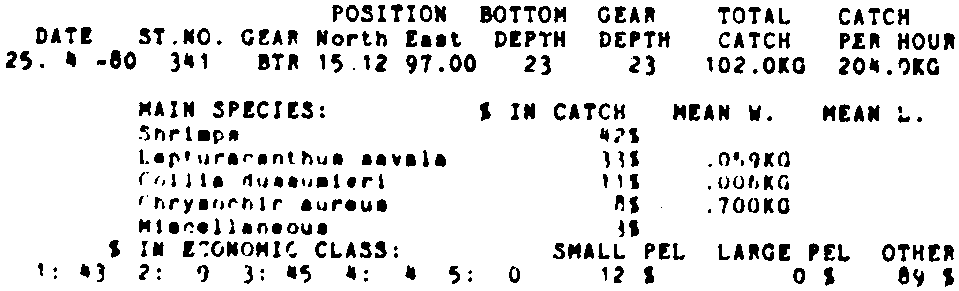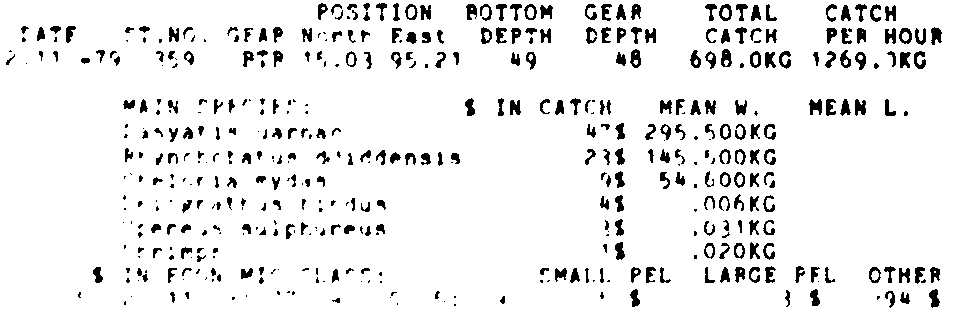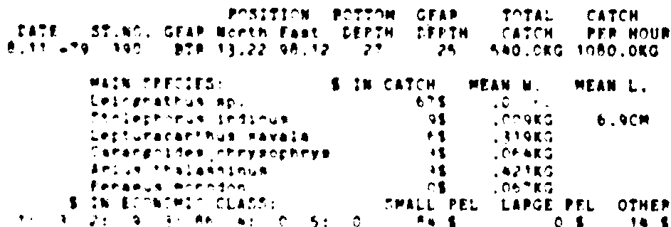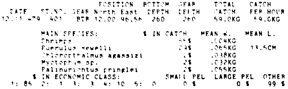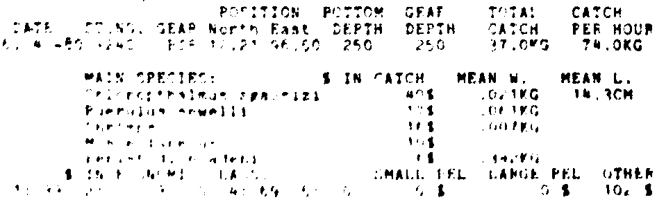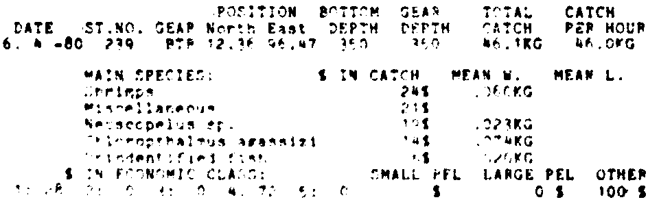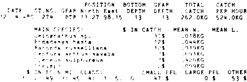 Only the five most important species are listed plus all shrimp catches. For some of the species the percentage of total catch is given as 0%. This means that the species in question is present at the station, but is less than 1% of the total catch.