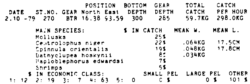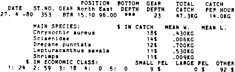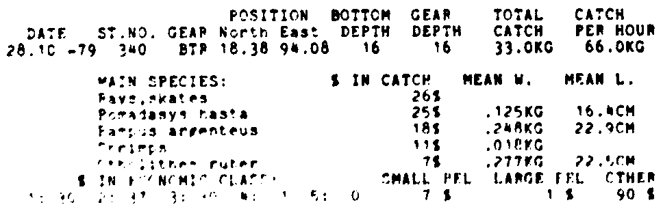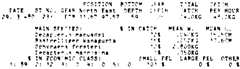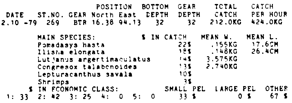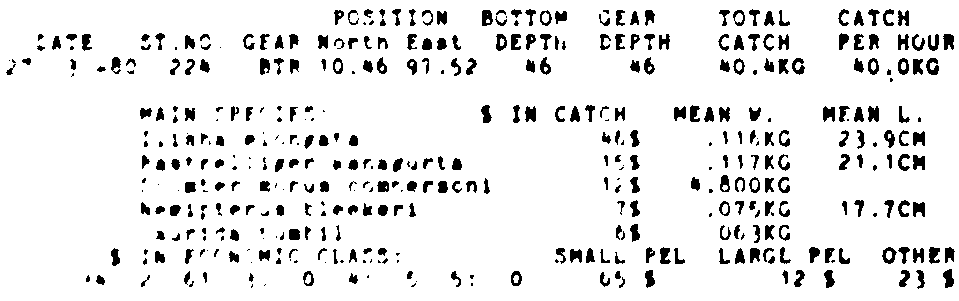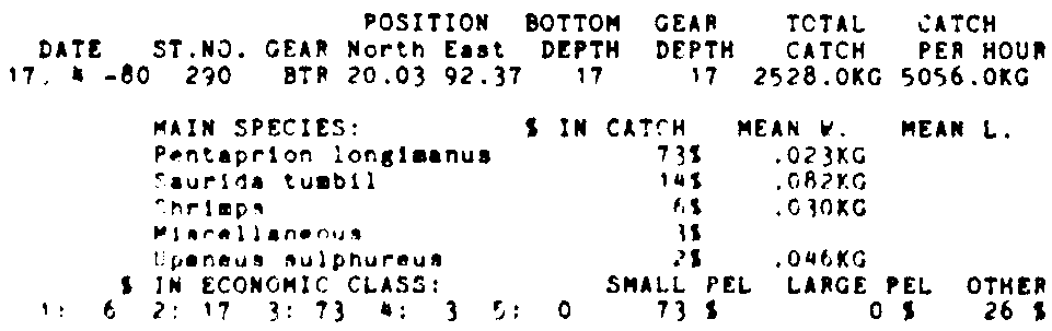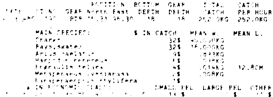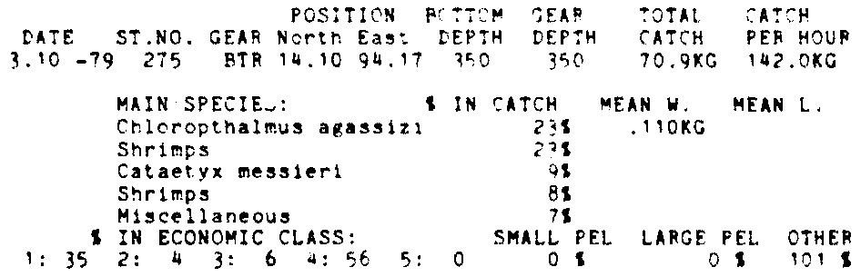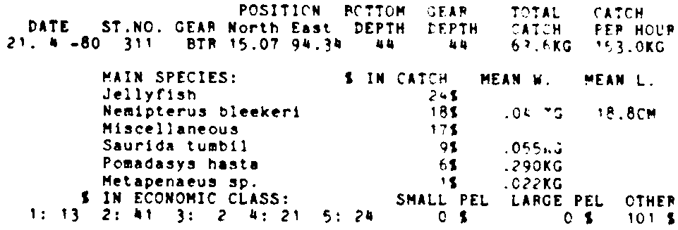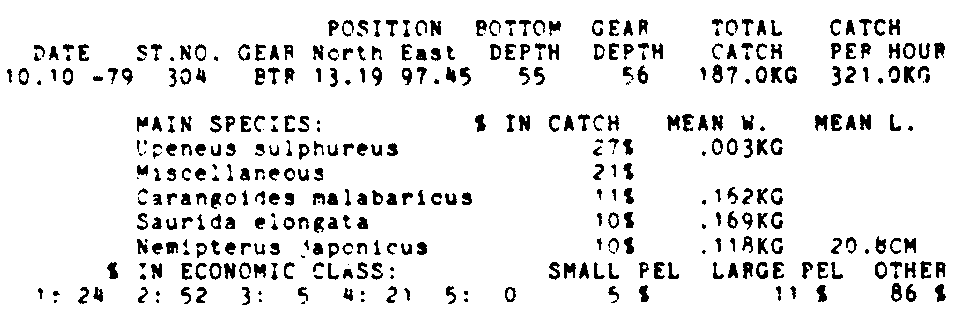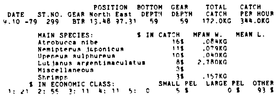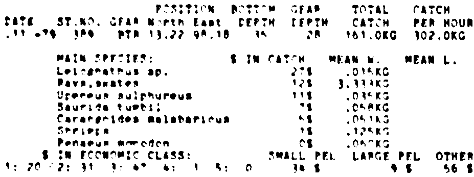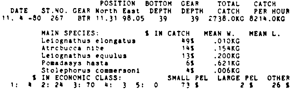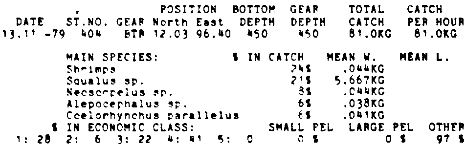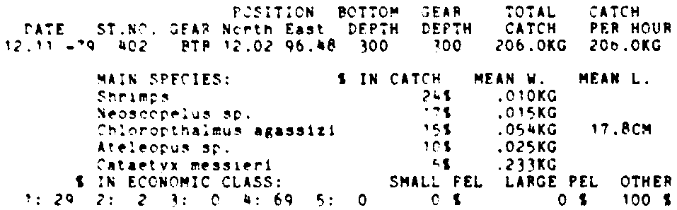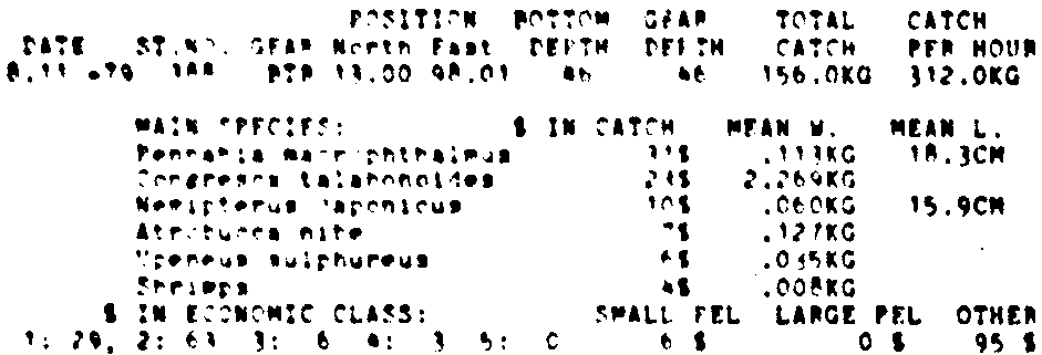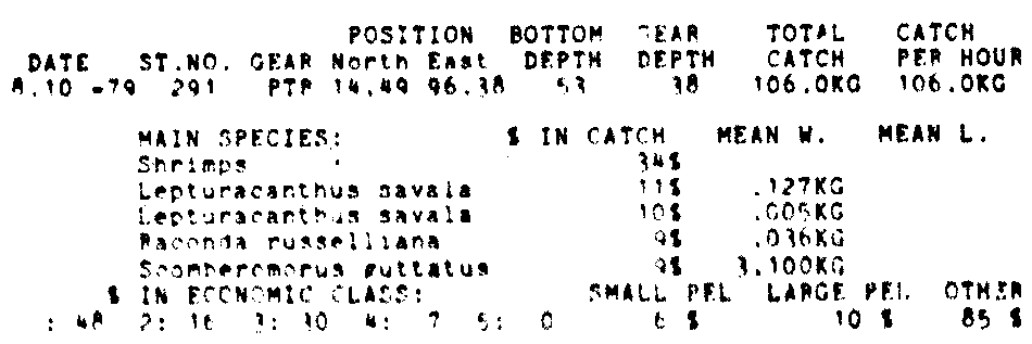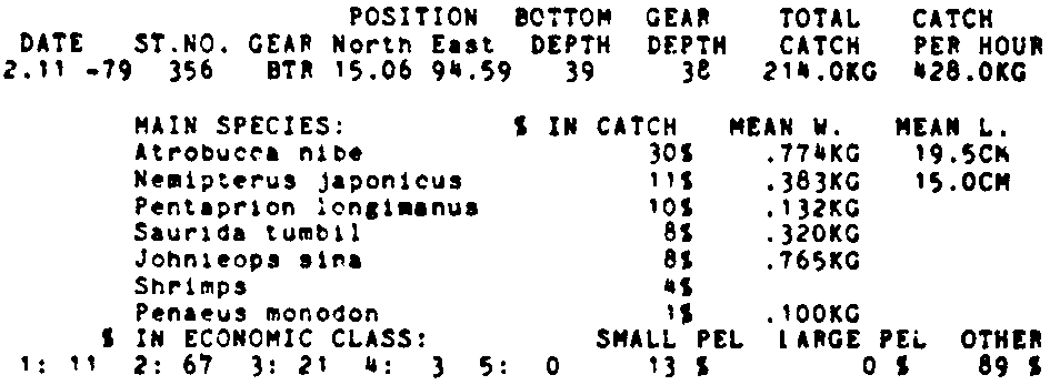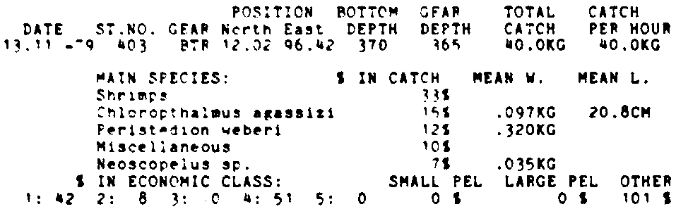 Only the five most important species are listed plus all shrimp catches. For some of the species the percentage of total catch is given as 0%. This means that the species in question is present at the station, but is less than 1% of the total catch.