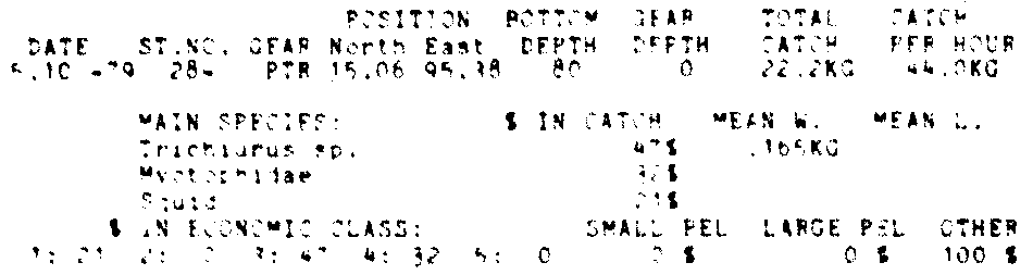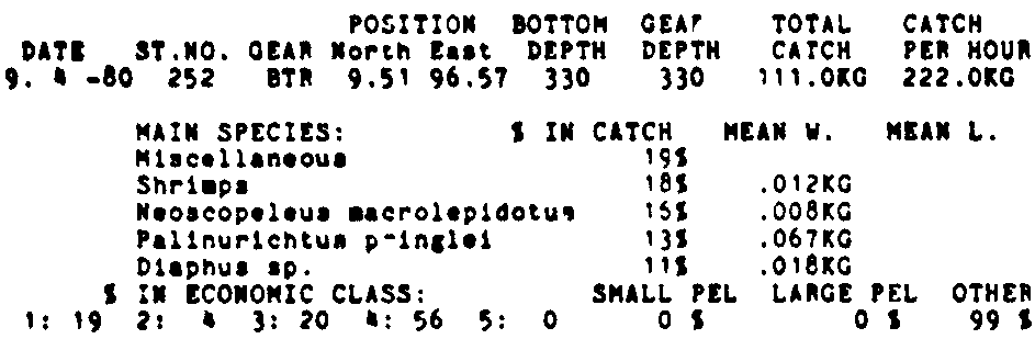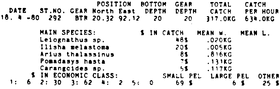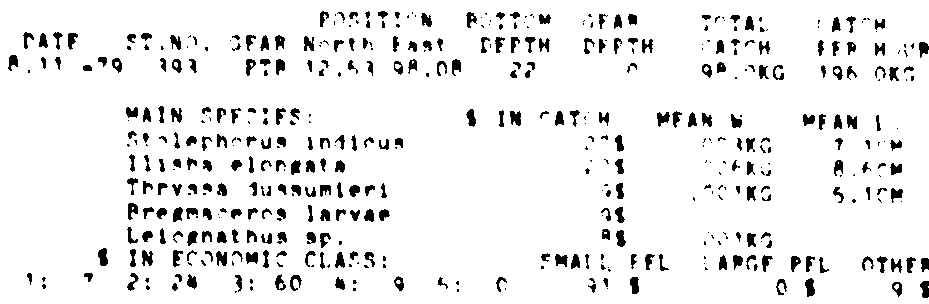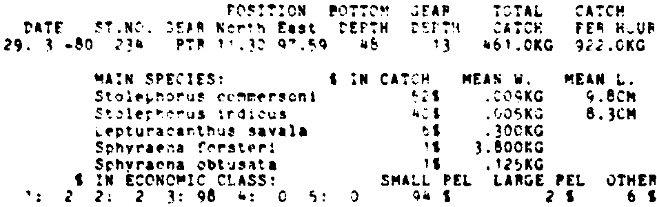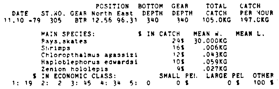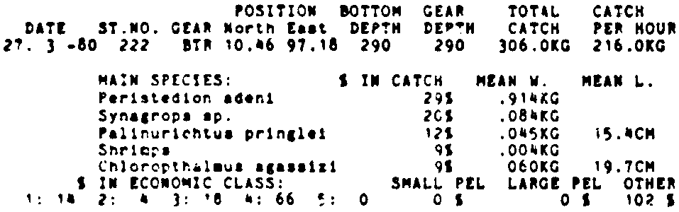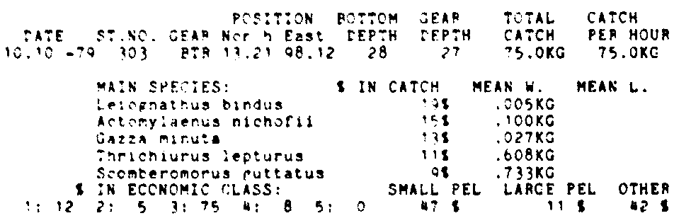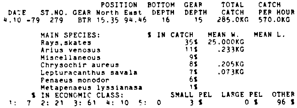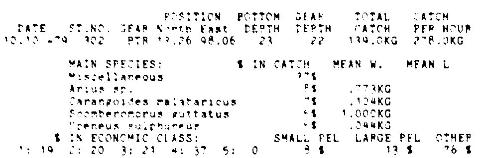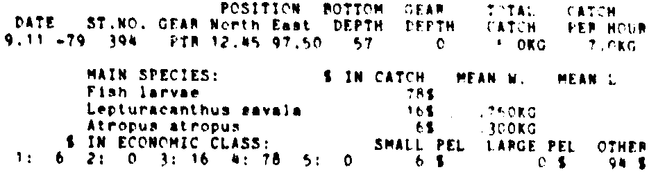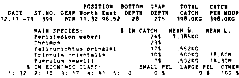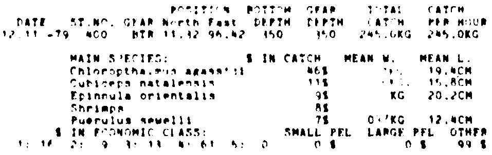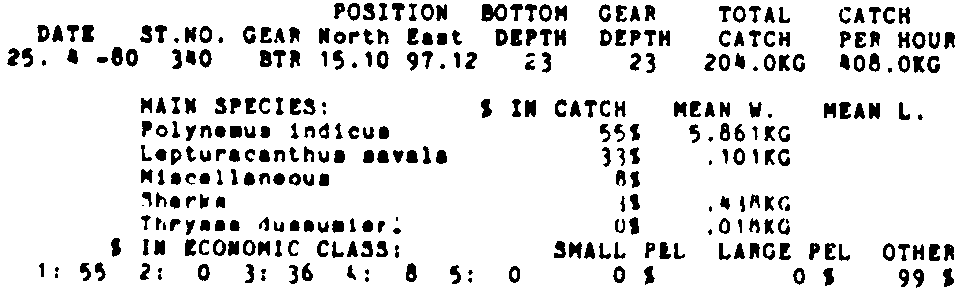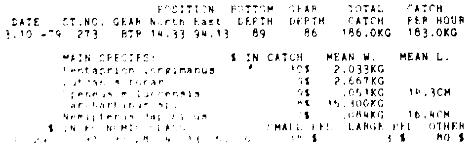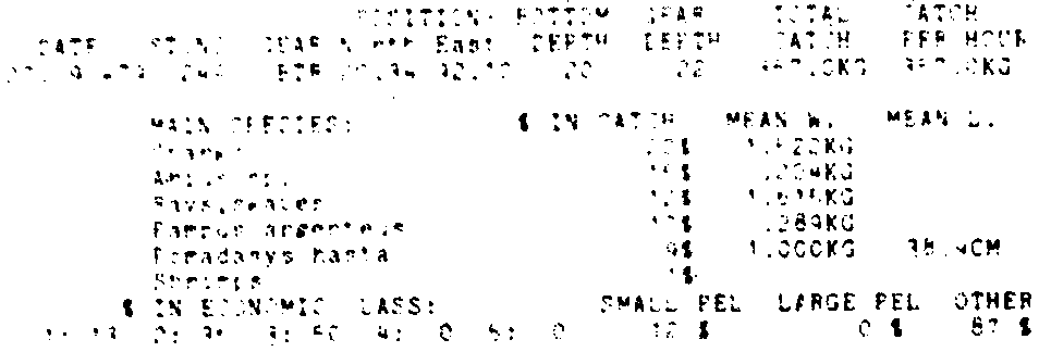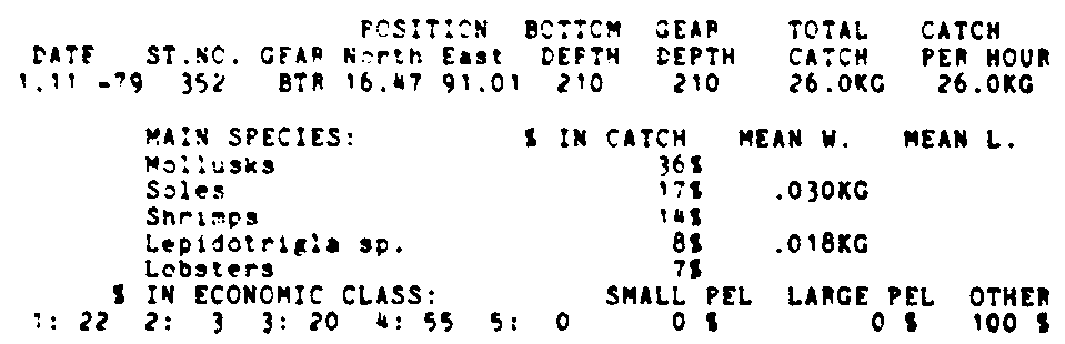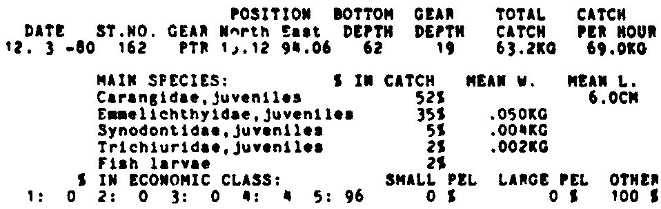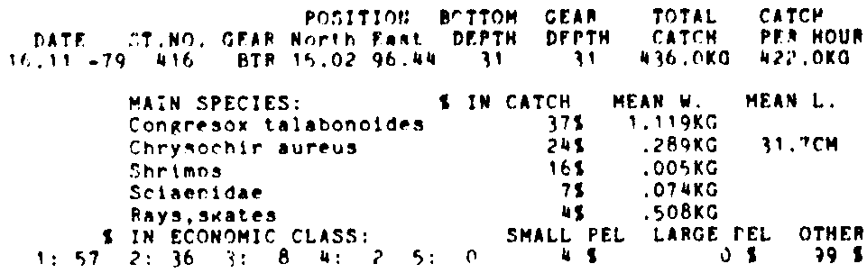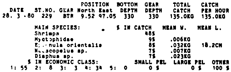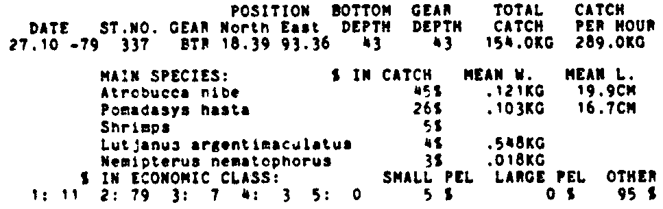 Only the five most important species are listed plus all shrimp catches. For some of the species the percentage of total catch is given as 0%. This means that the species in question is present at the station, but is less than 1% of the total catch.