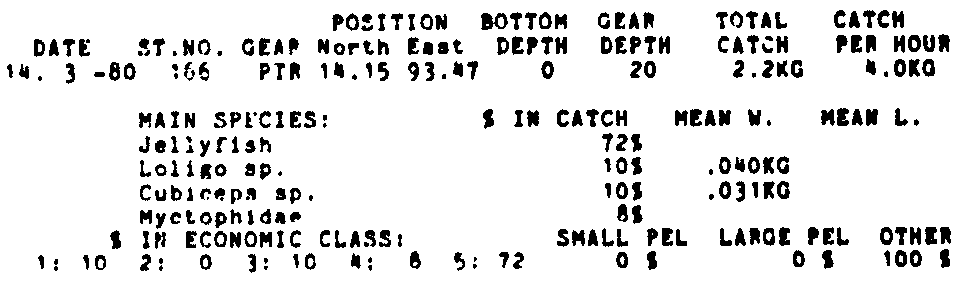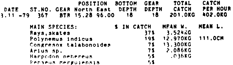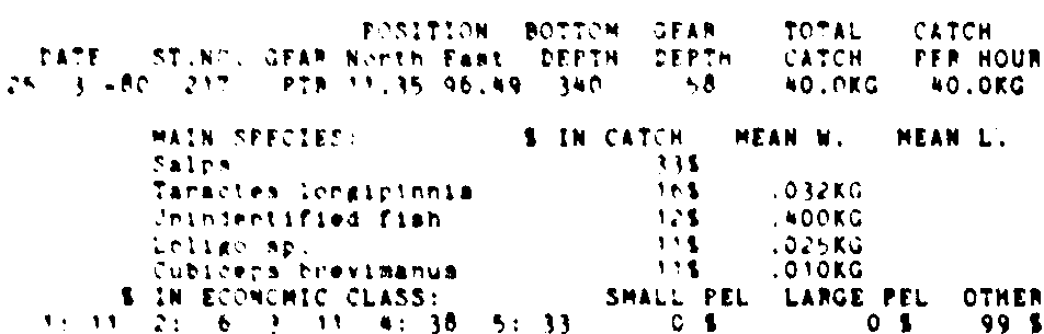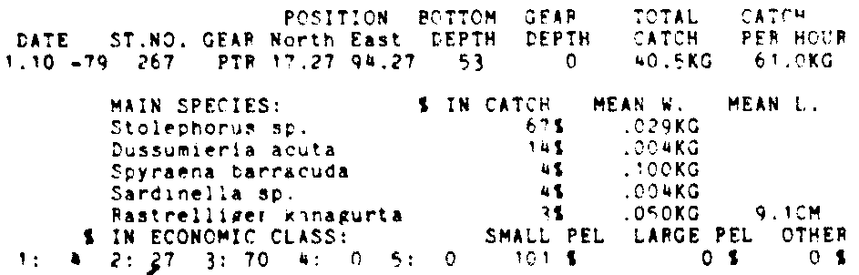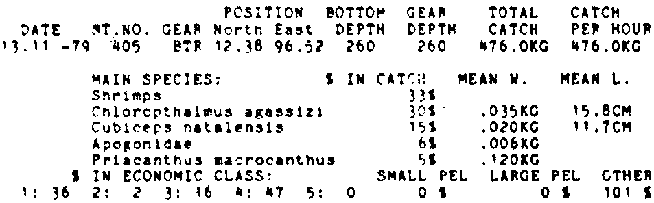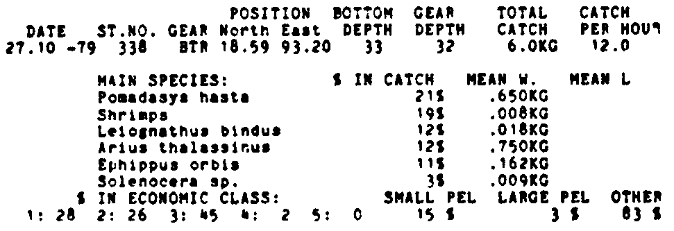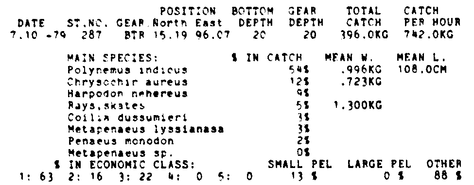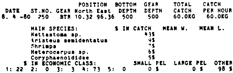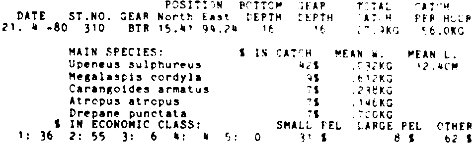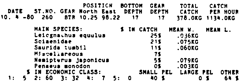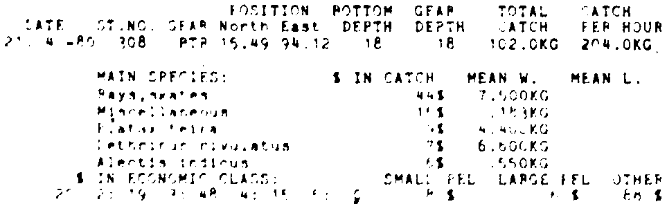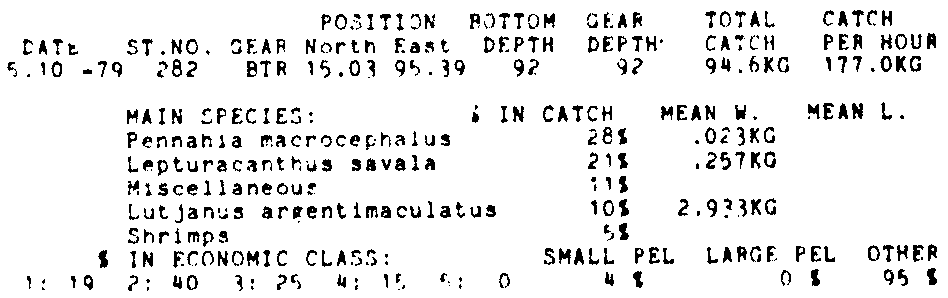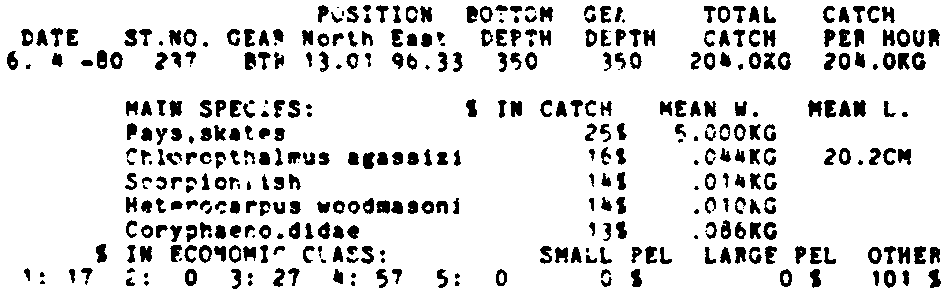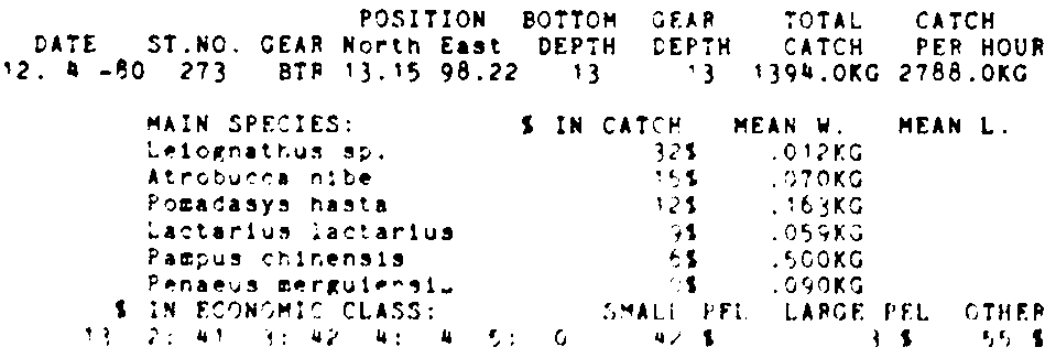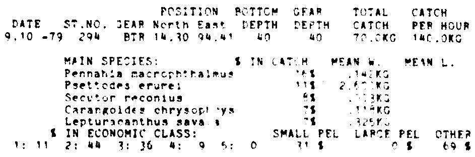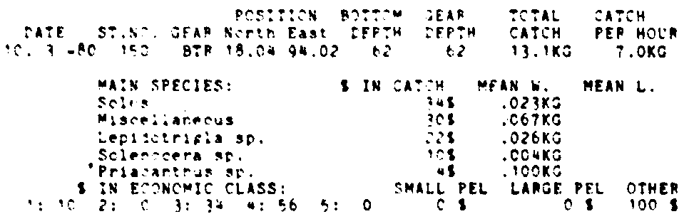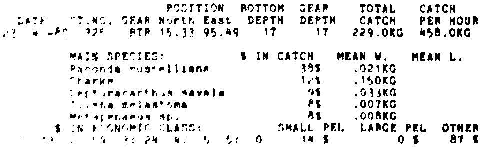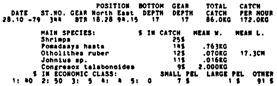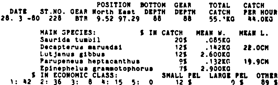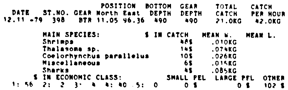 Only the five most important species are listed plus all shrimp catches. For some of the species the percentage of total catch is given as 0%. This means that the species in question is present at the station, but is less than 1% of the total catch.