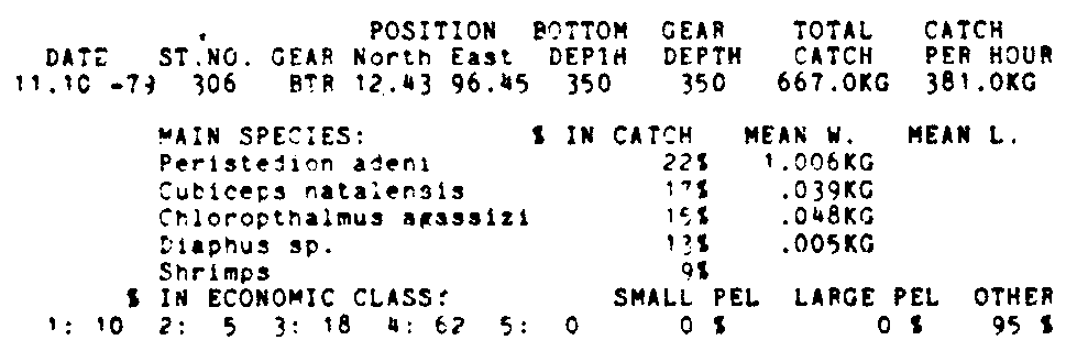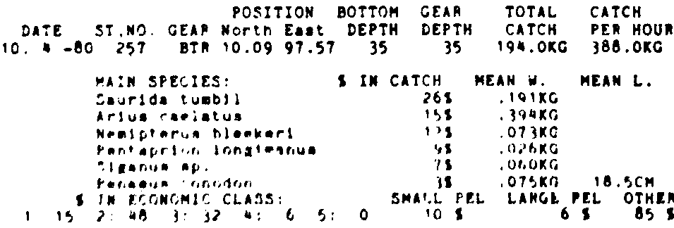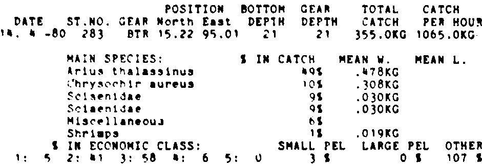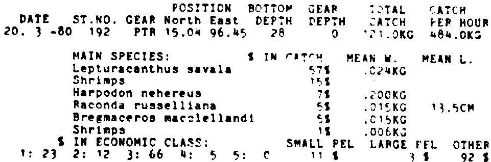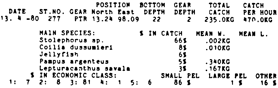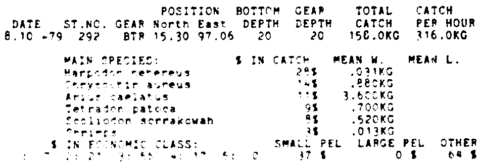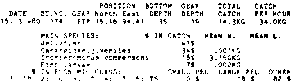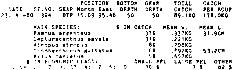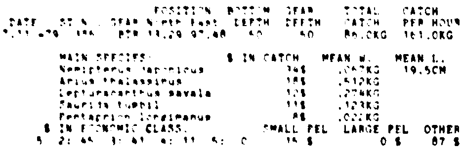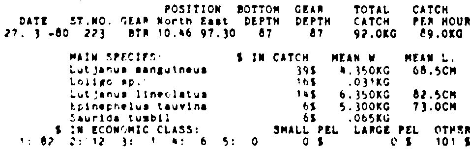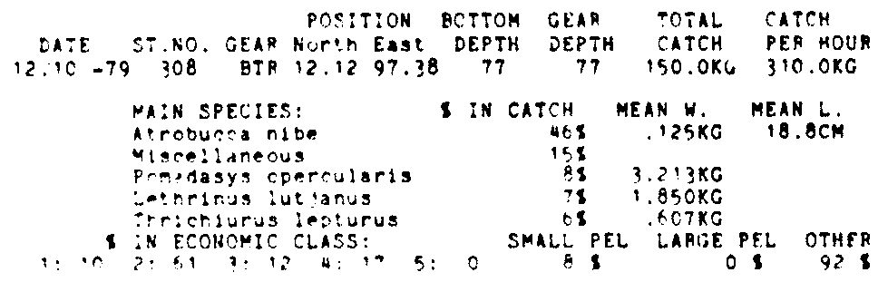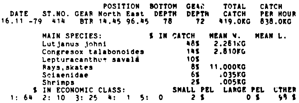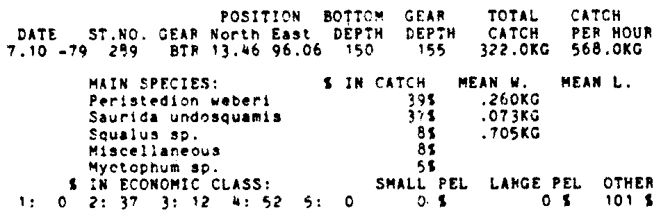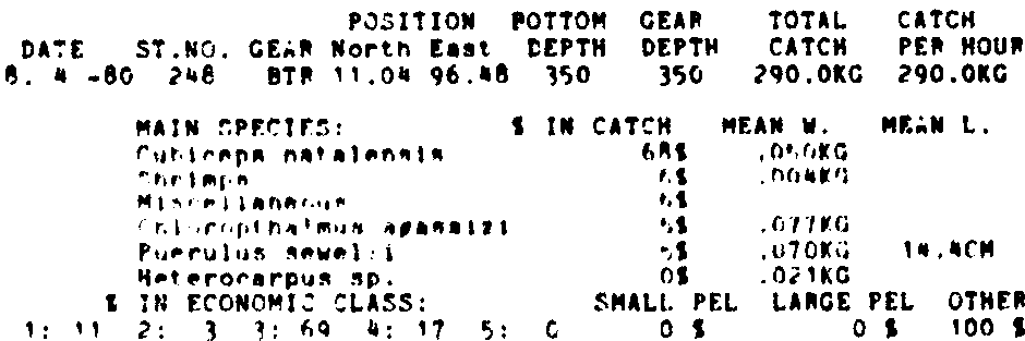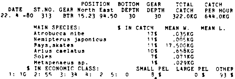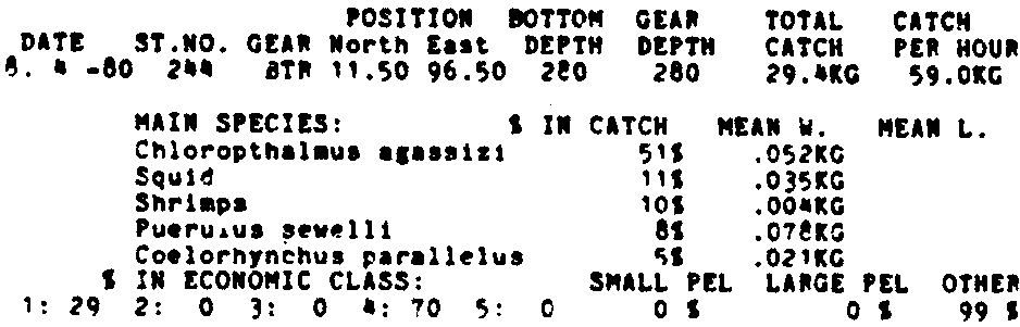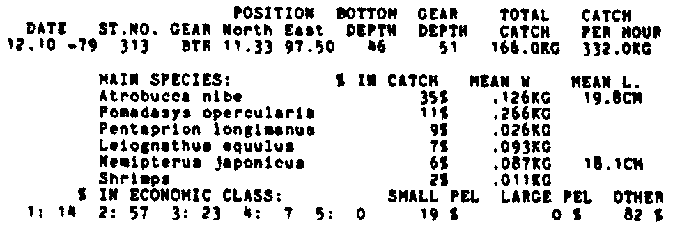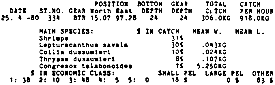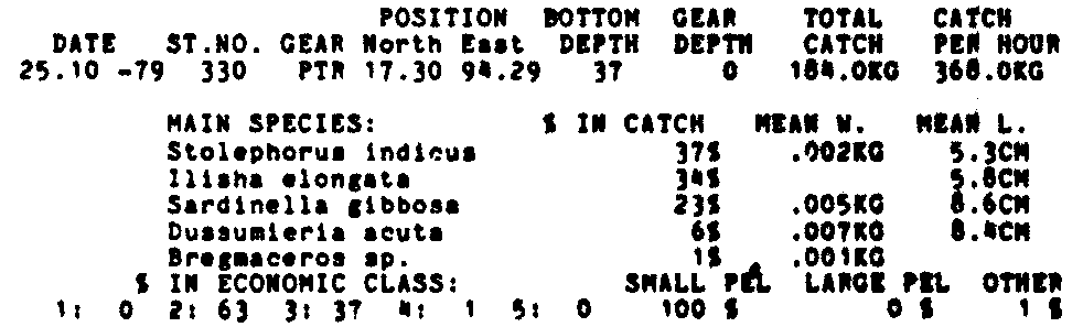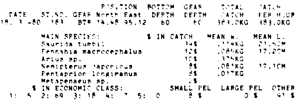 Only the five most important species are listed plus all shrimp catches. For some of the species the percentage of total catch is given as 0%. This means that the species in question is present at the station, but is less than 1% of the total catch.