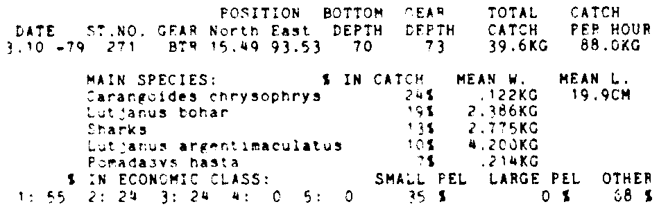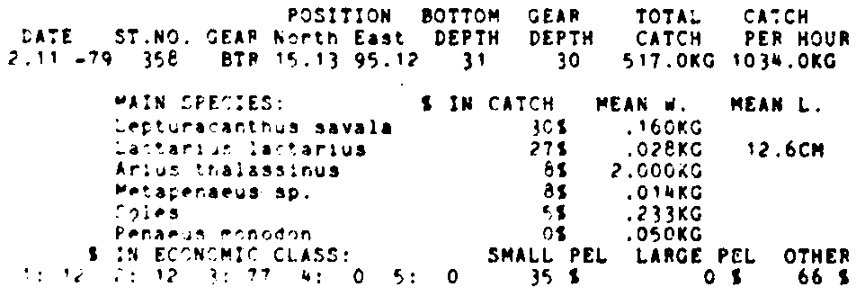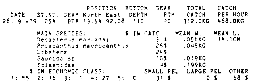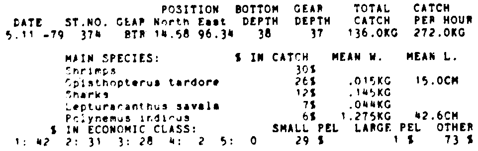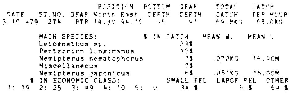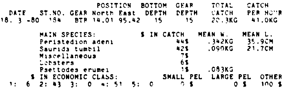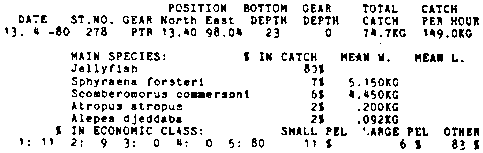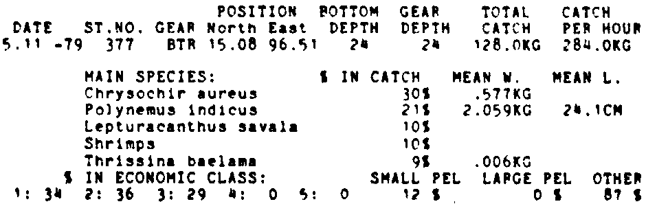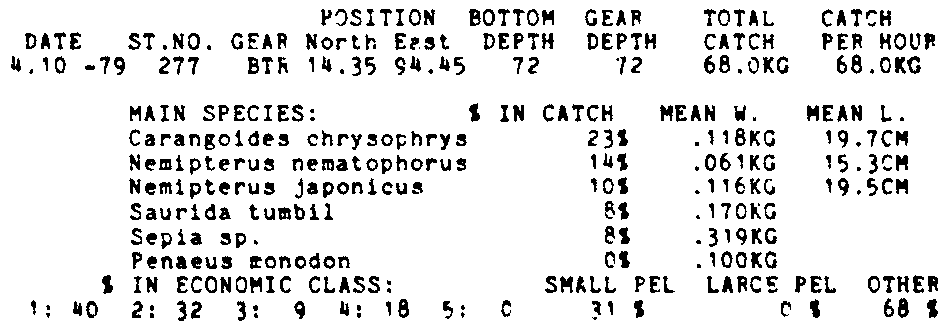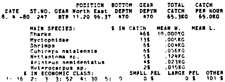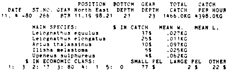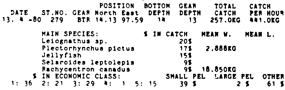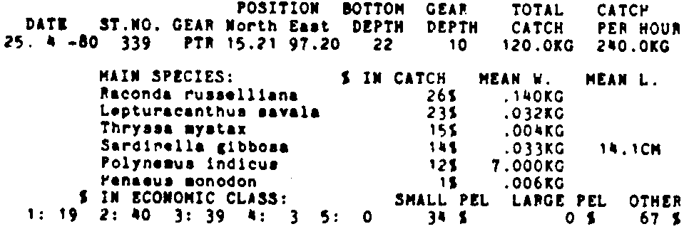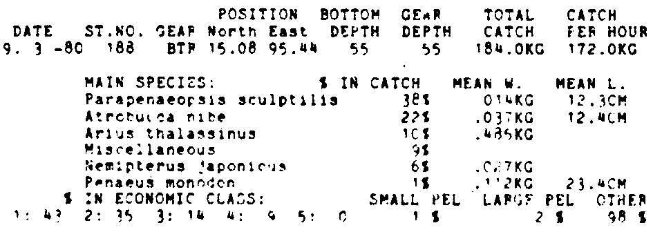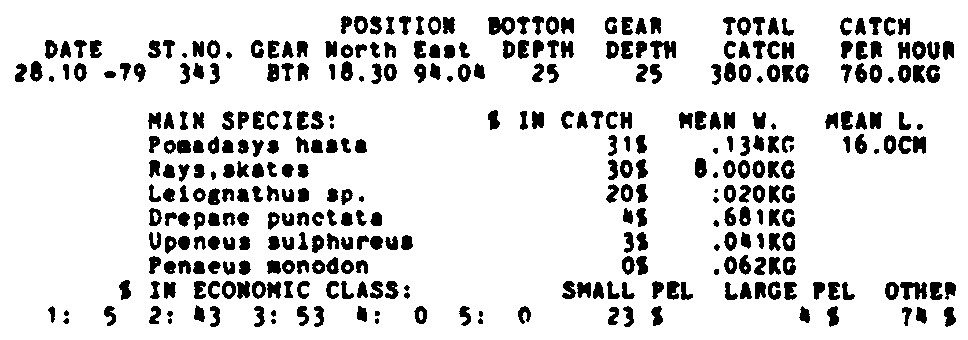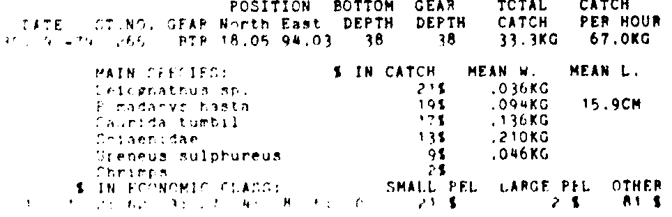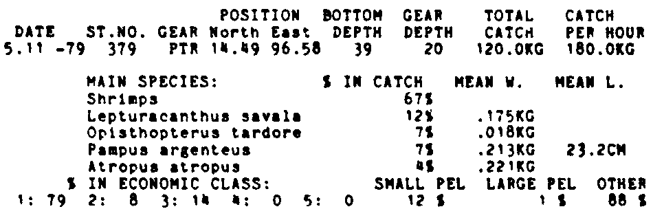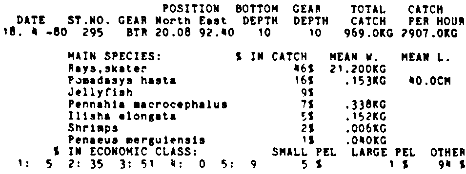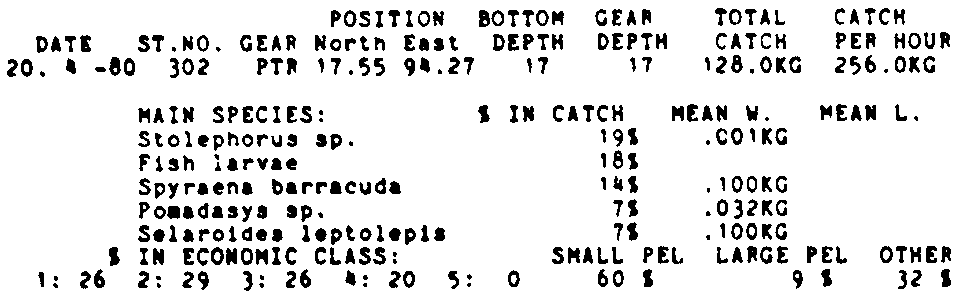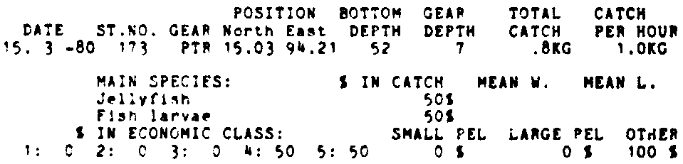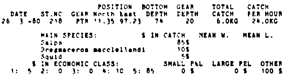 Only the five most important species are listed plus all shrimp catches. For some of the species the percentage of total catch is given as 0%. This means that the species in question is present at the station, but is less than 1% of the total catch.