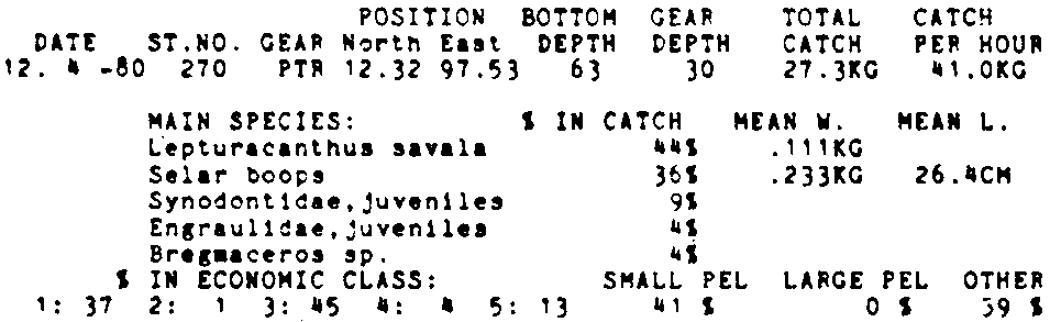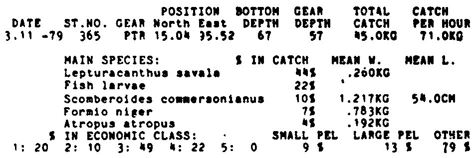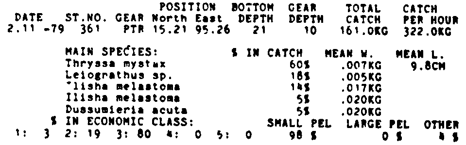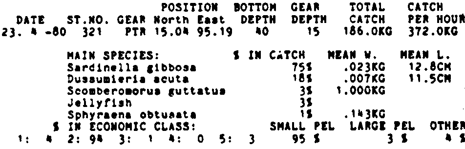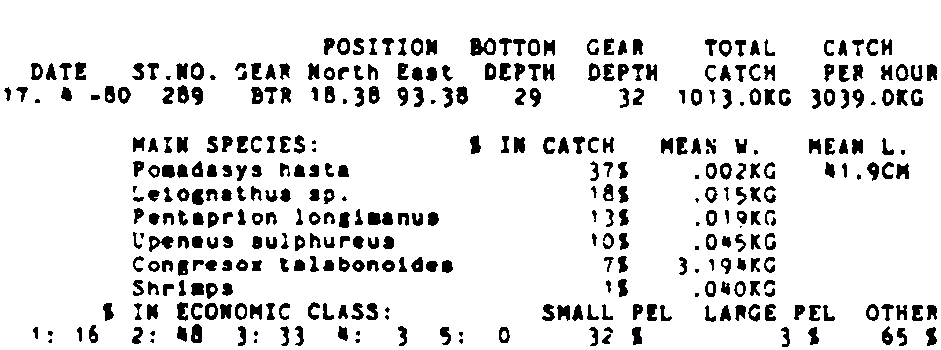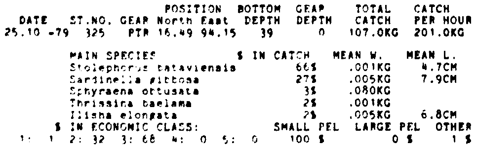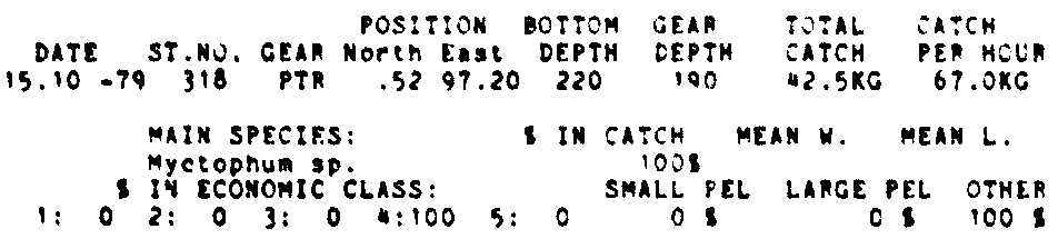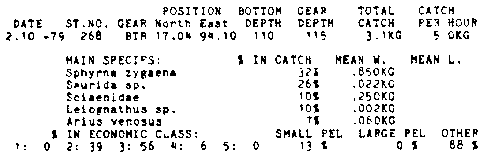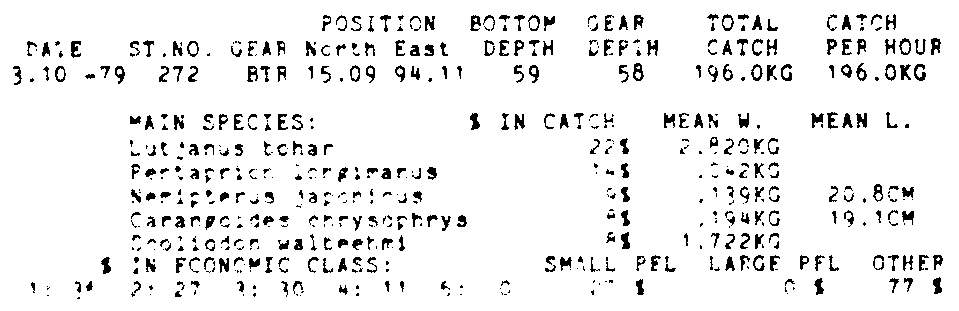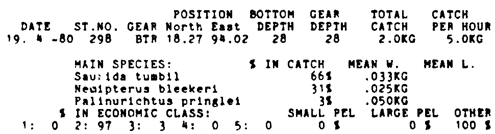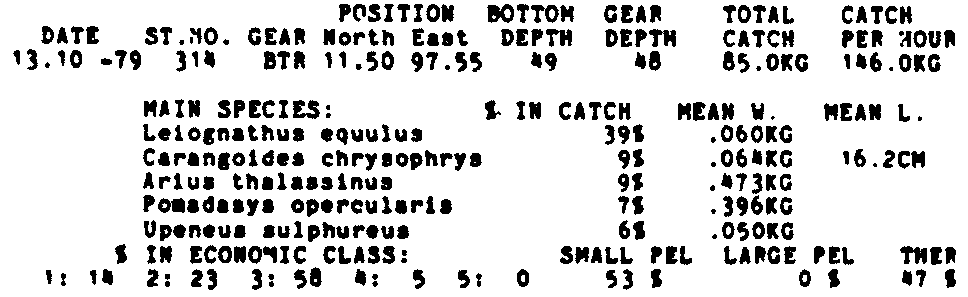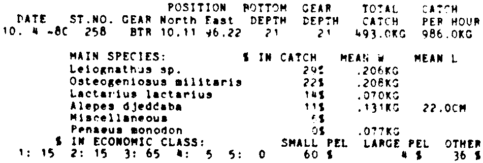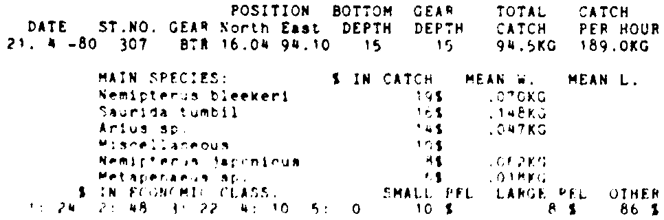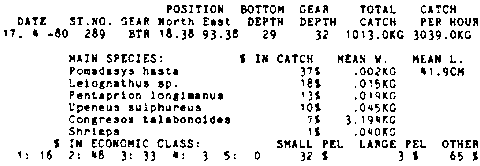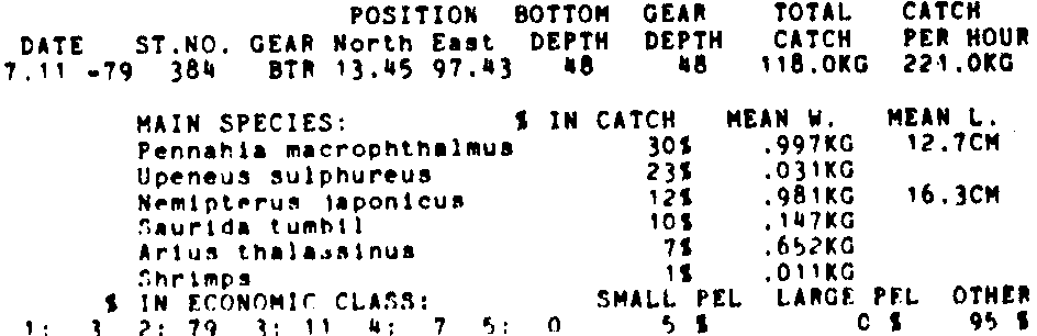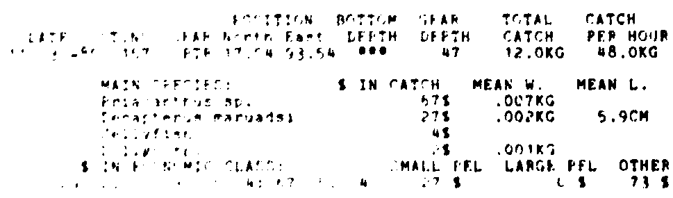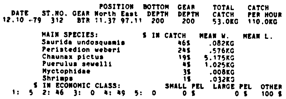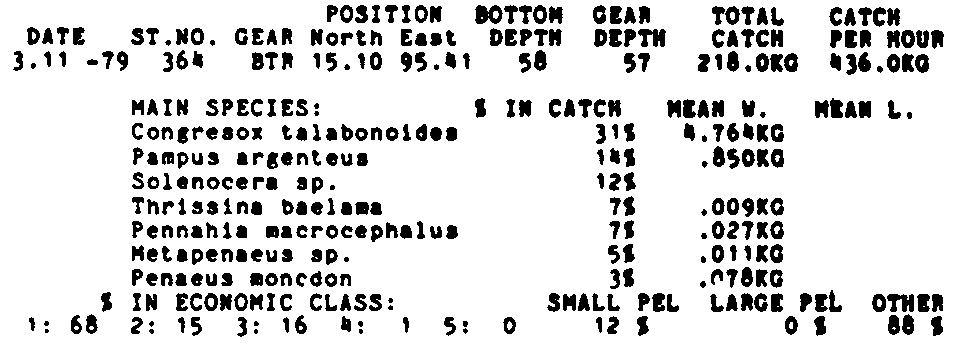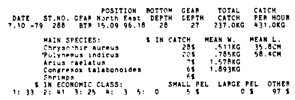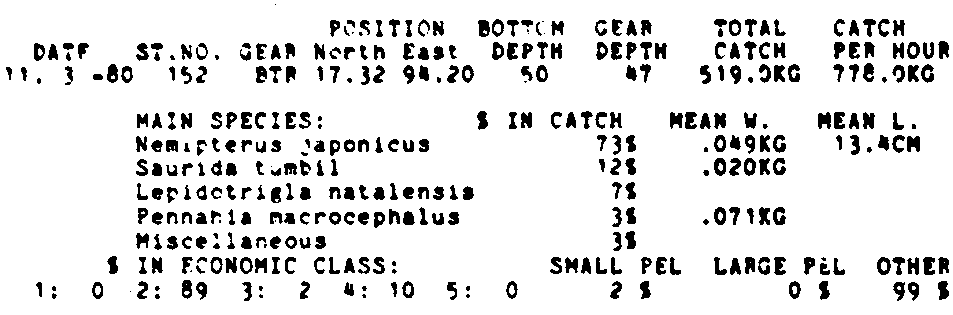 Only the five most important species are listed plus all shrimp catches. For some of the species the percentage of total catch is given as 0%. This means that the species in question is present at the station, but is less than 1% of the total catch.