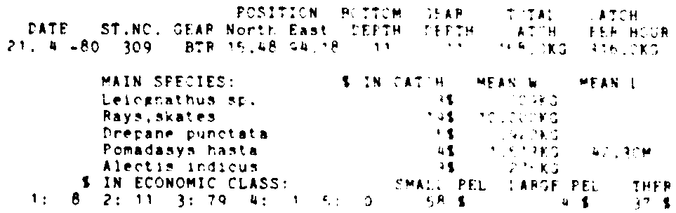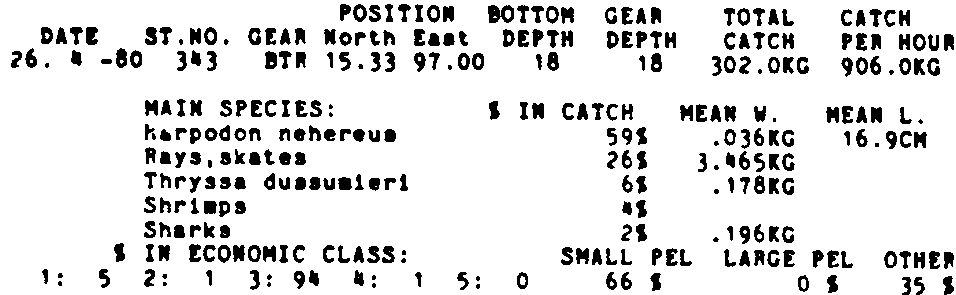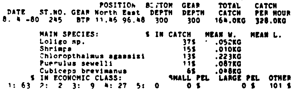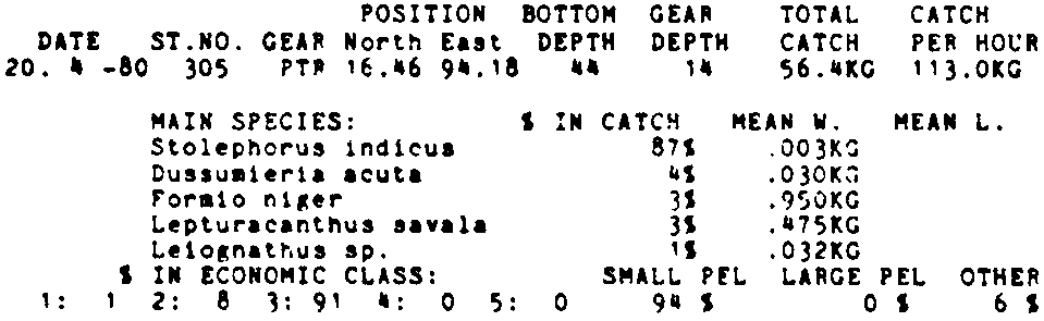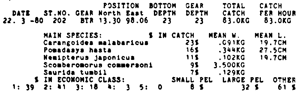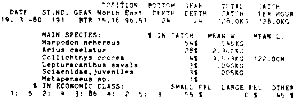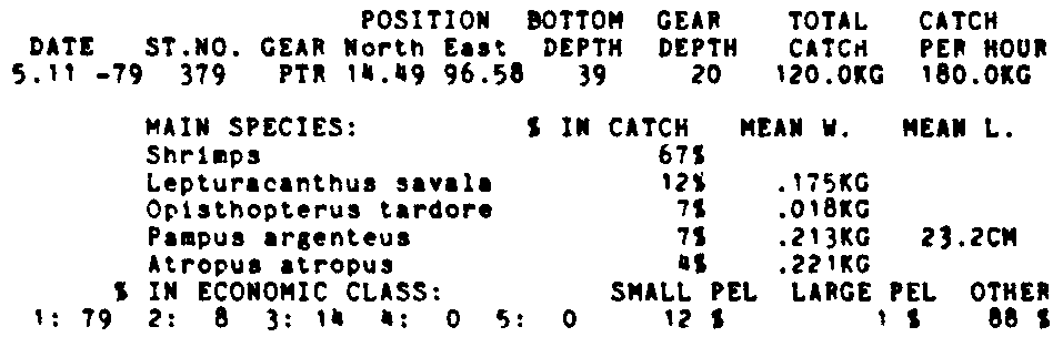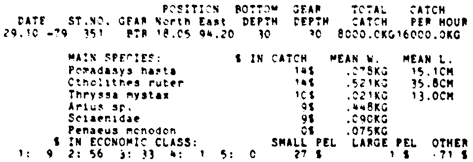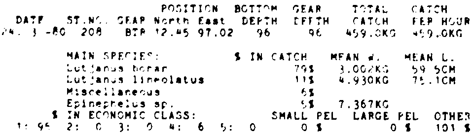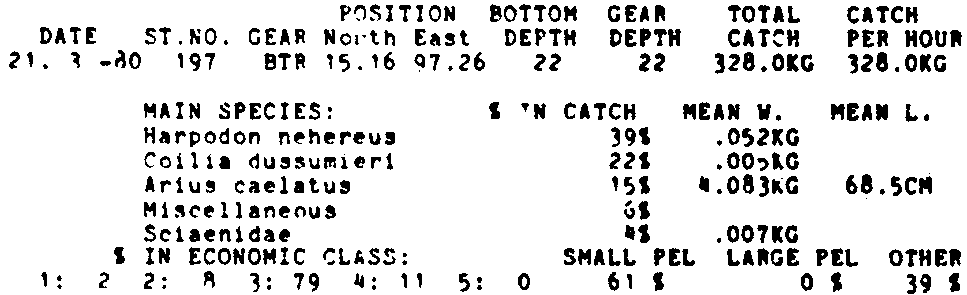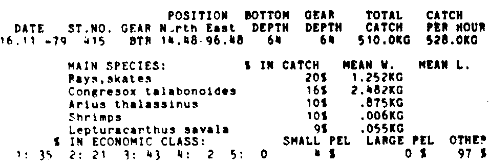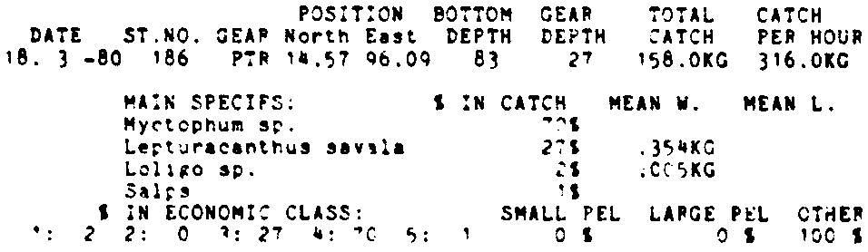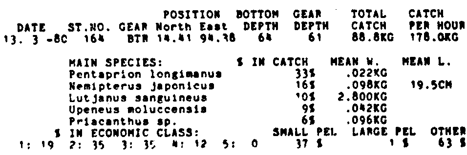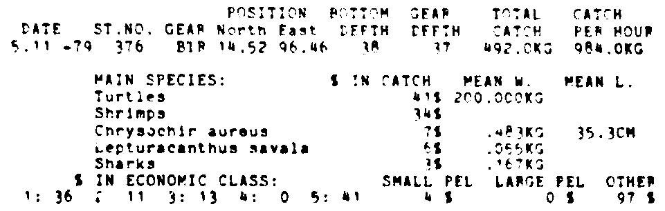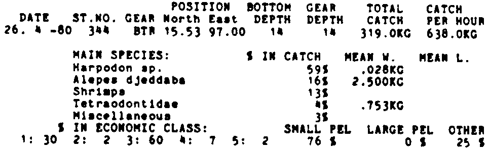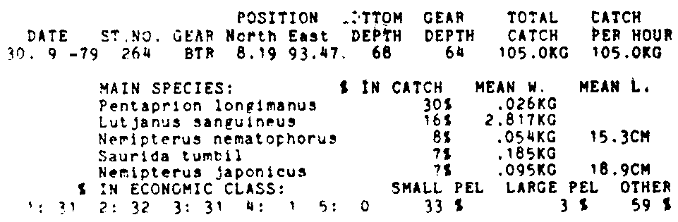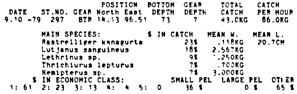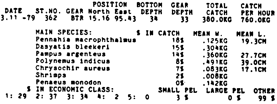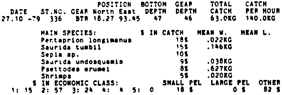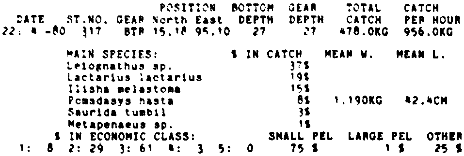 Only the five most important species are listed plus all shrimp catches. For some of the species the percentage of total catch is given as 0%. This means that the species in question is present at the station, but is less than 1% of the total catch.