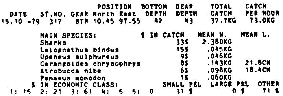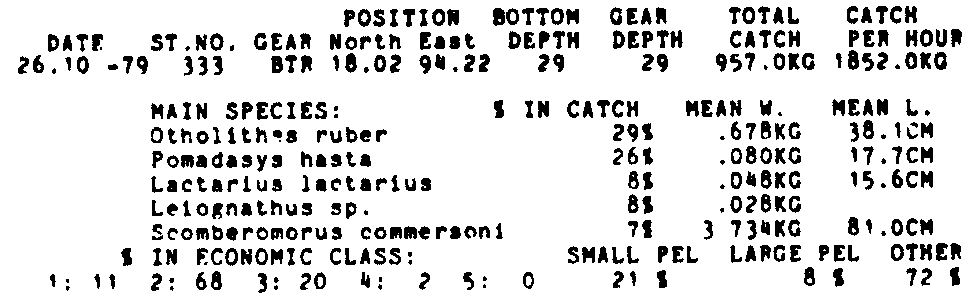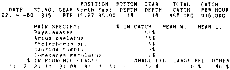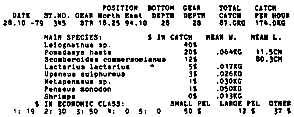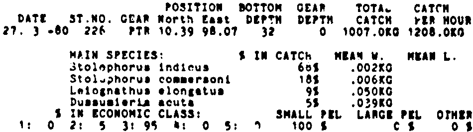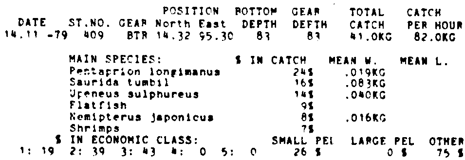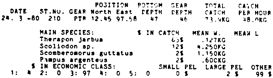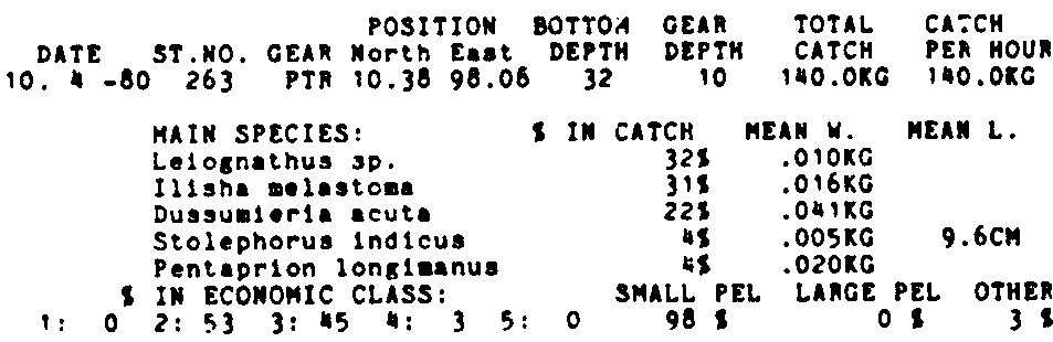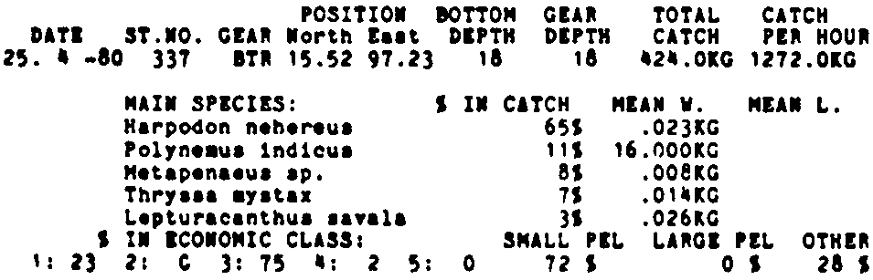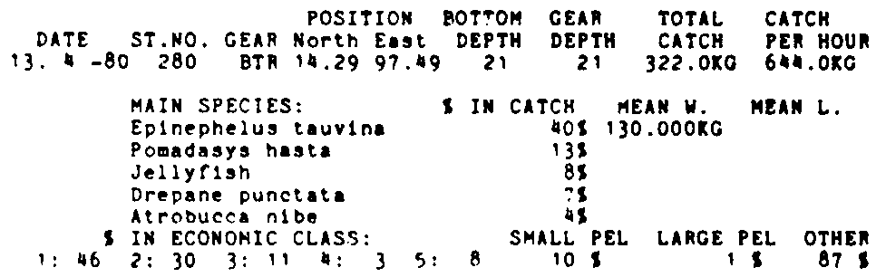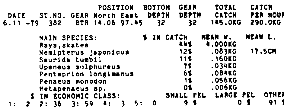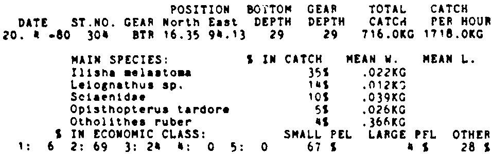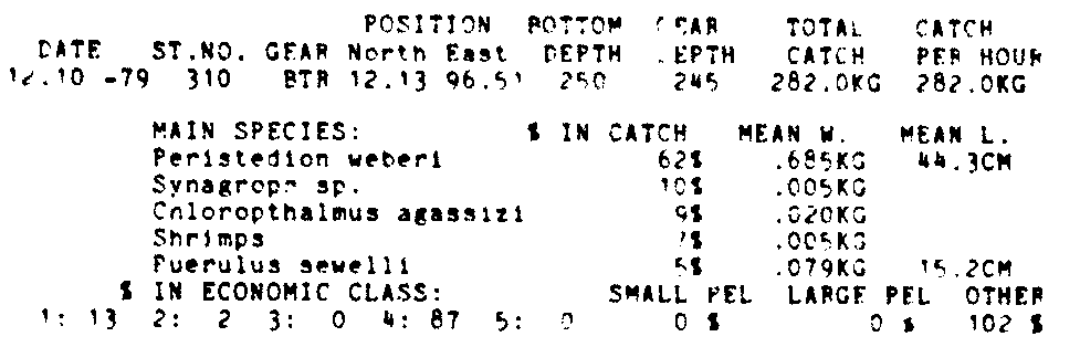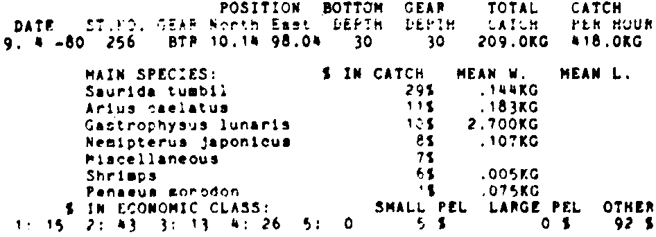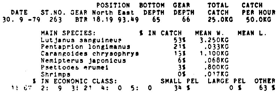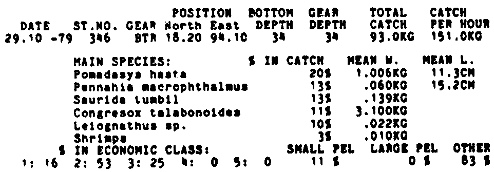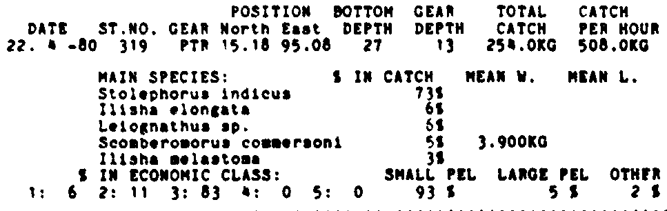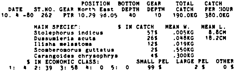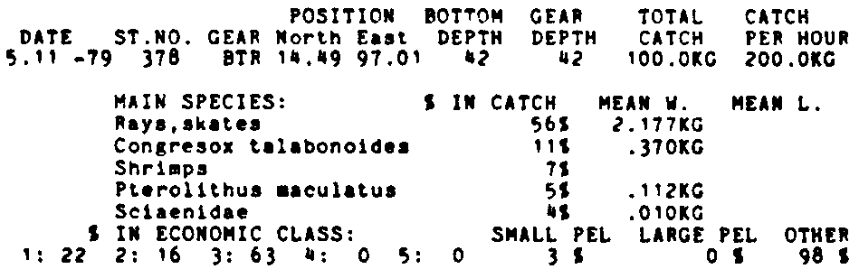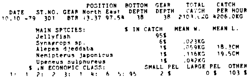 Only the five most important species are listed plus all shrimp catches. For some of the species the percentage of total catch is given as 0%. This means that the species in question is present at the station, but is less than 1% of the total catch.