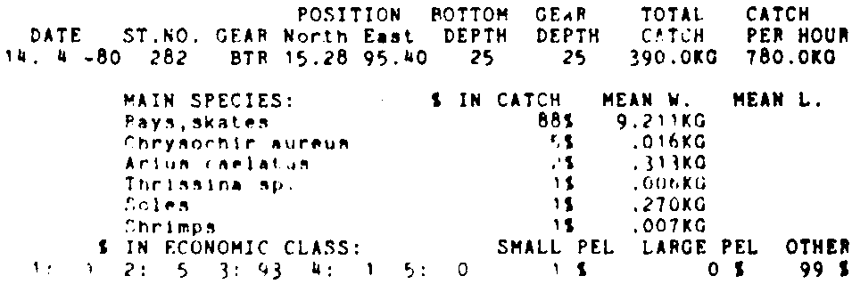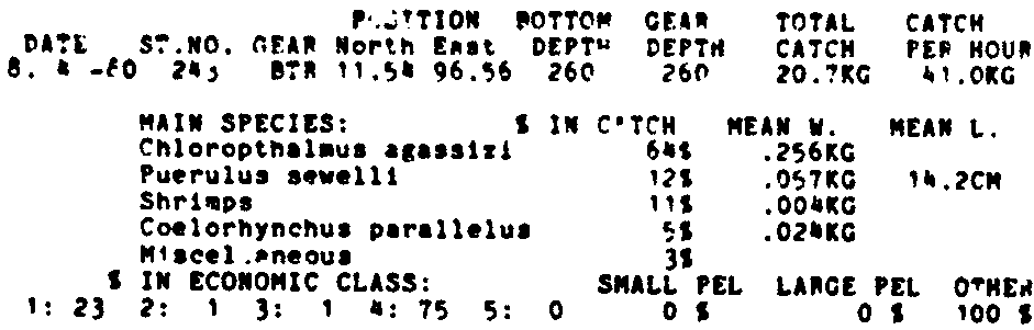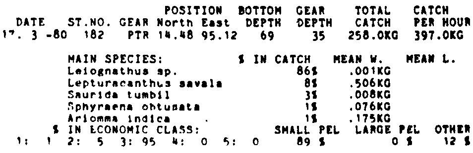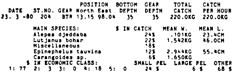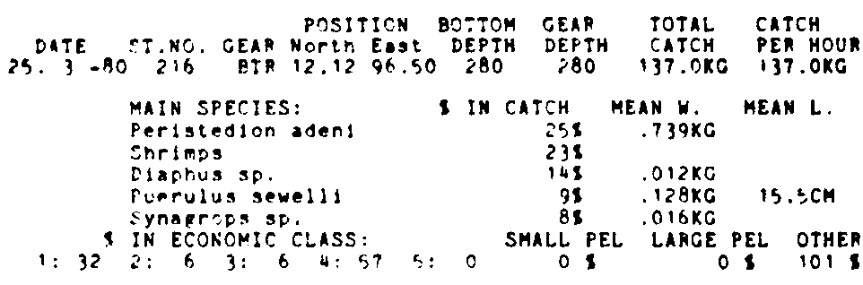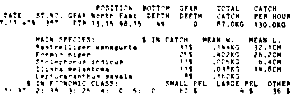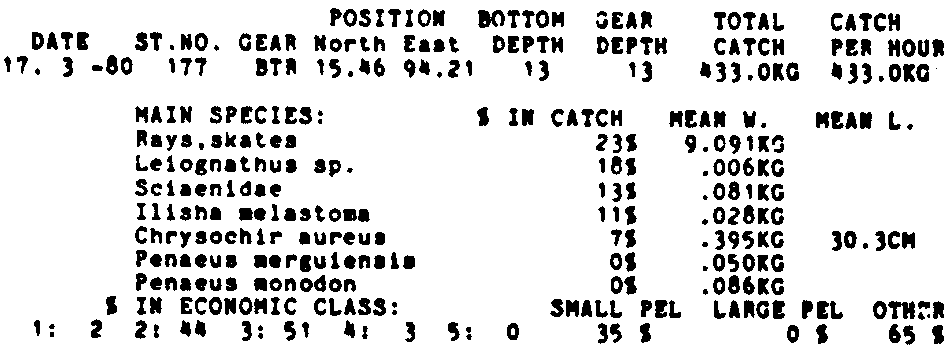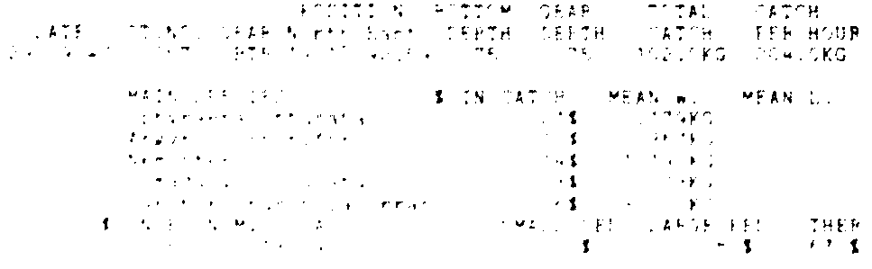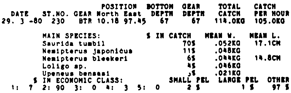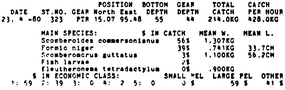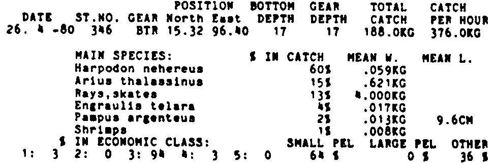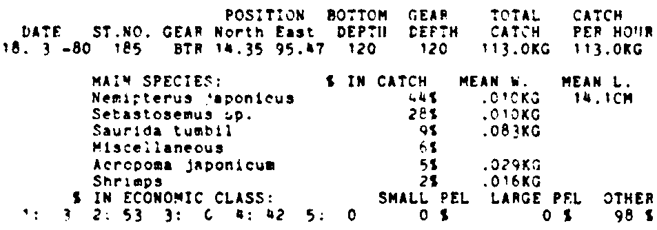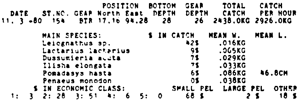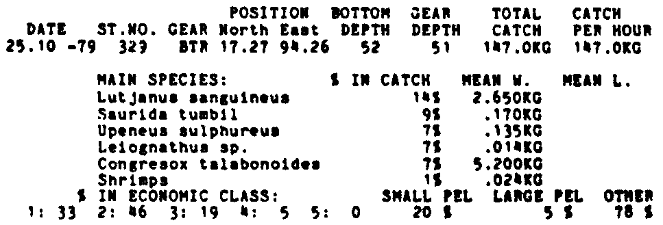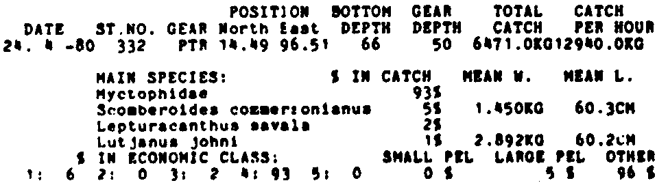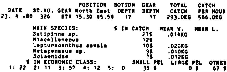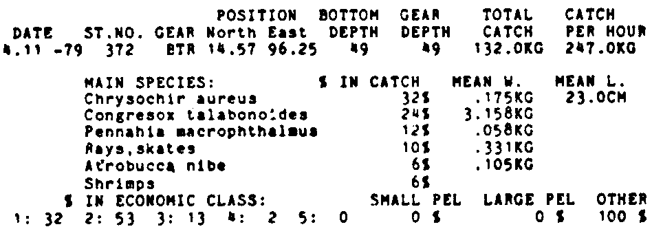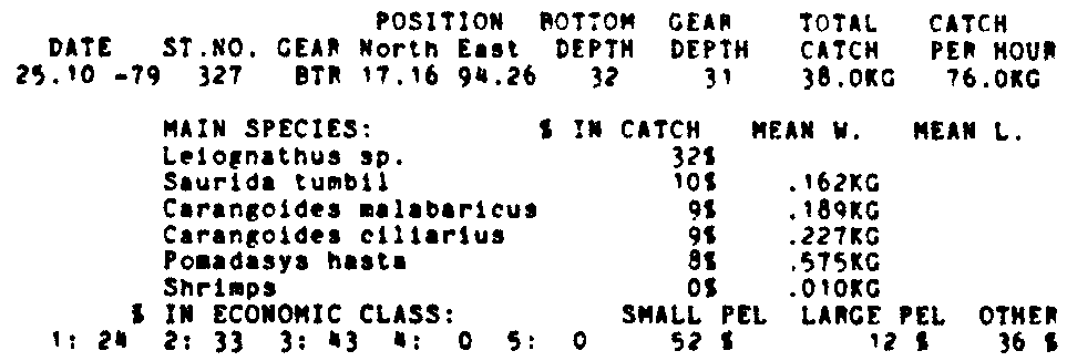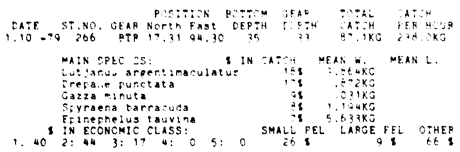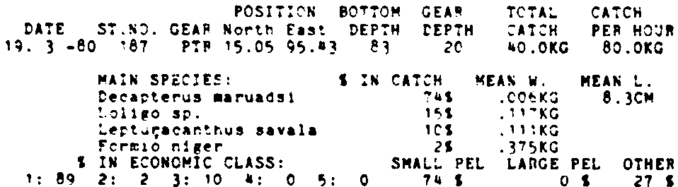 Only the five most important species are listed plus all shrimp catches. For some of the species the percentage of total catch is given as 0%. This means that the species in question is present at the station, but is less than 1% of the total catch.