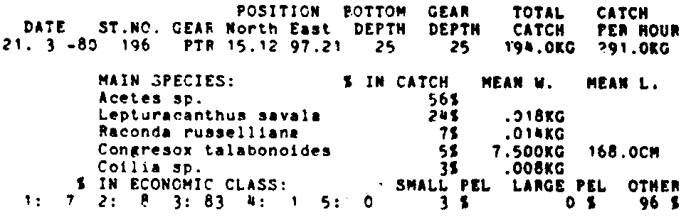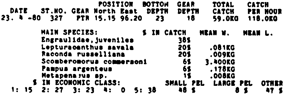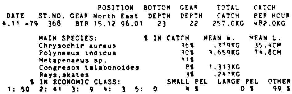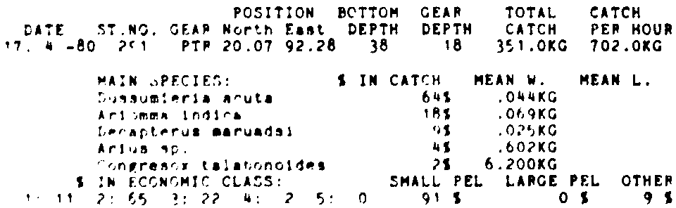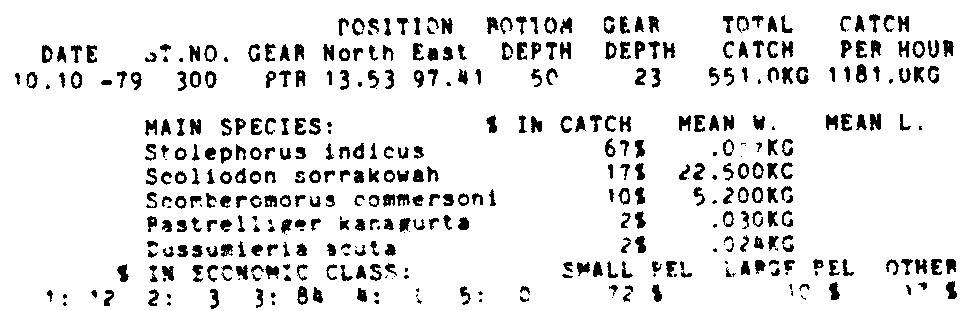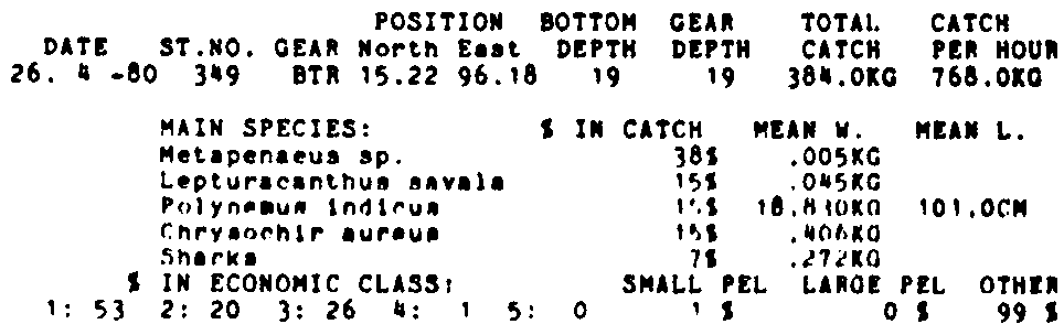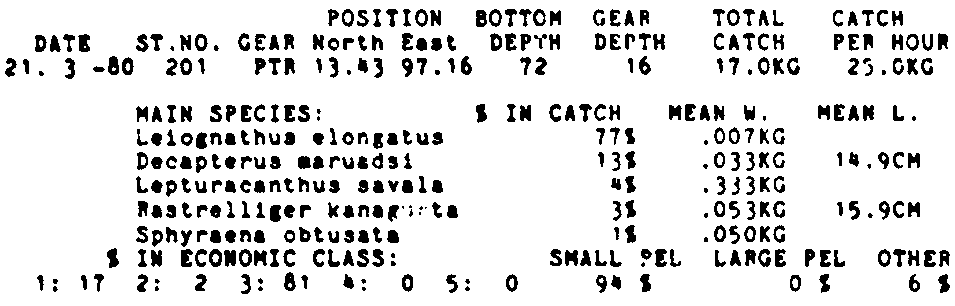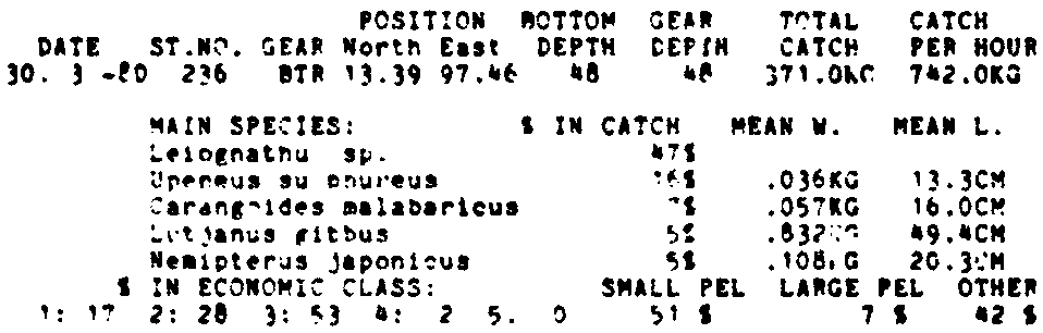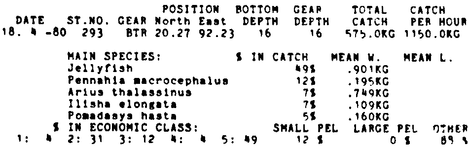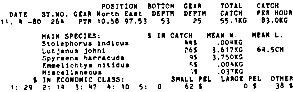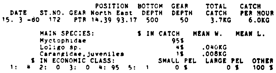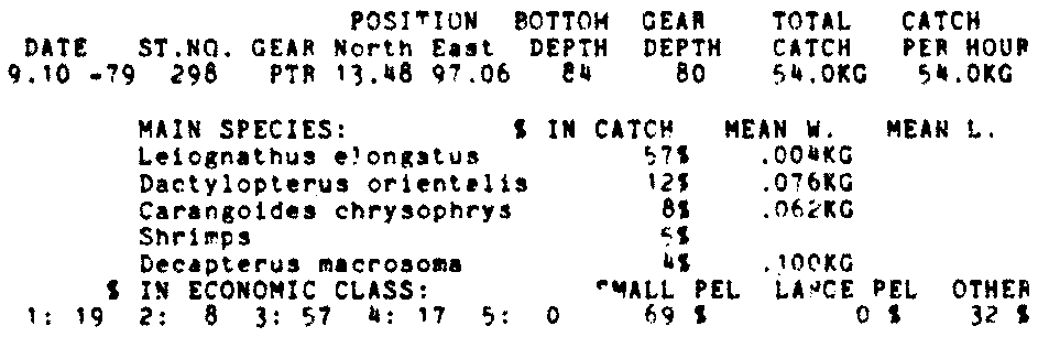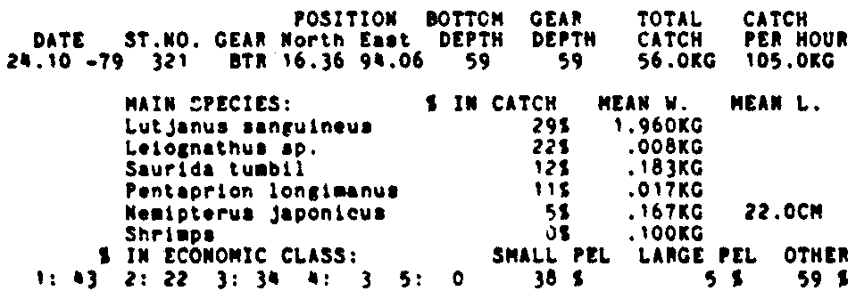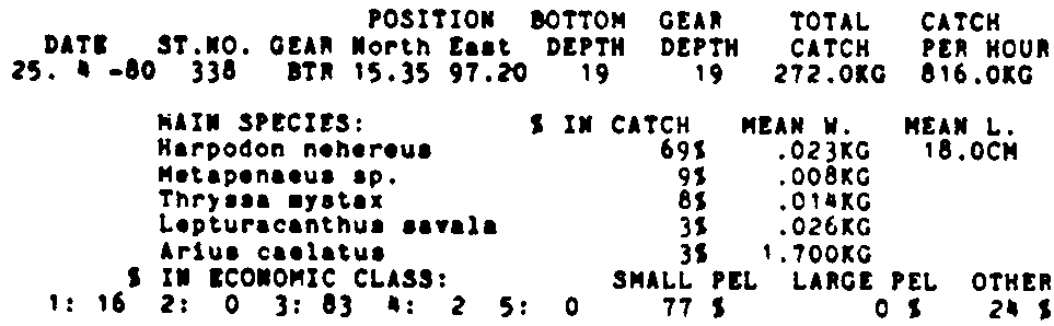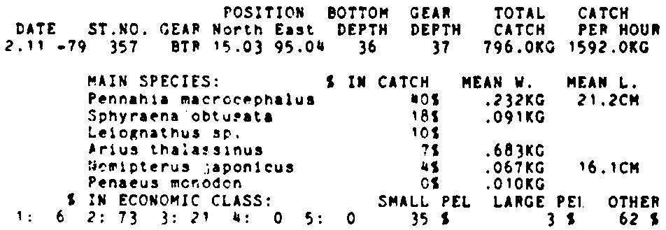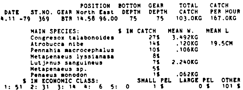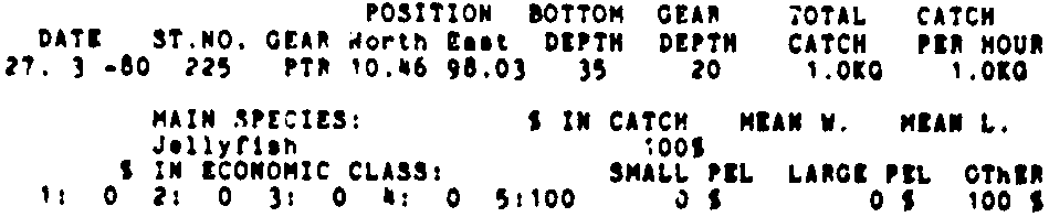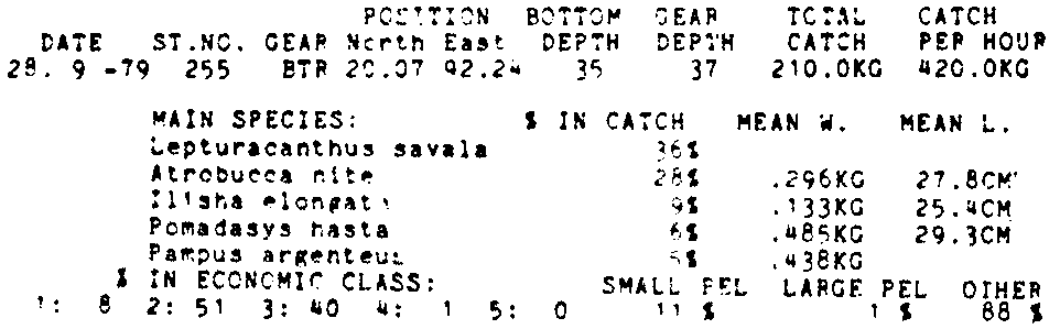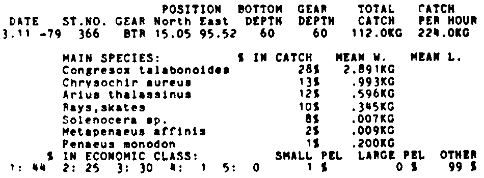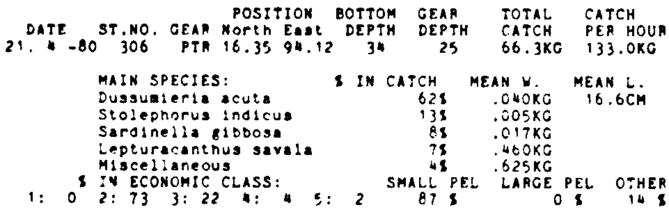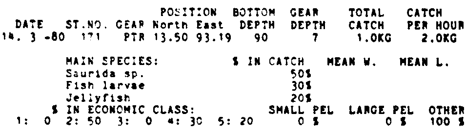 Only the five most important species are listed plus all shrimp catches. For some of the species the percentage of total catch is given as 0%. This means that the species in question is present at the station, but is less than 1% of the total catch.