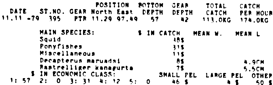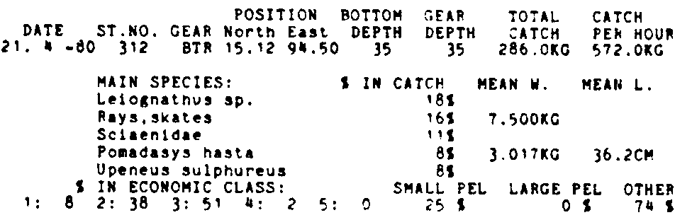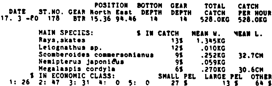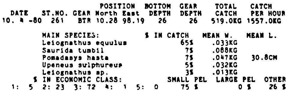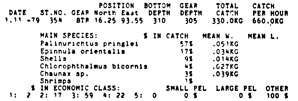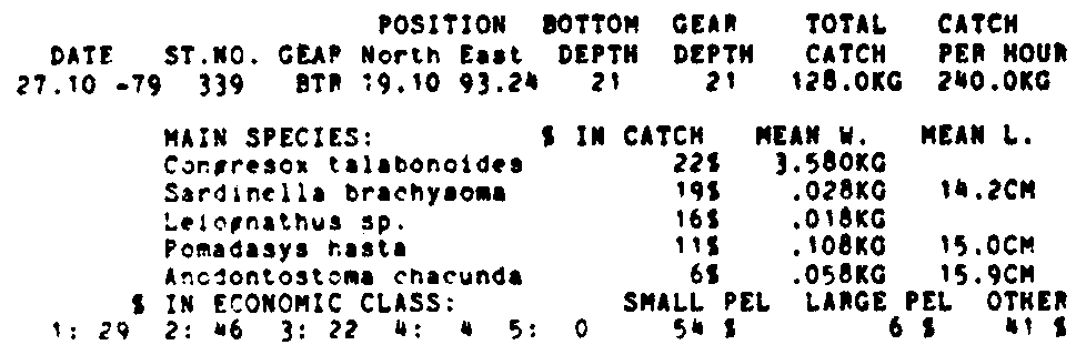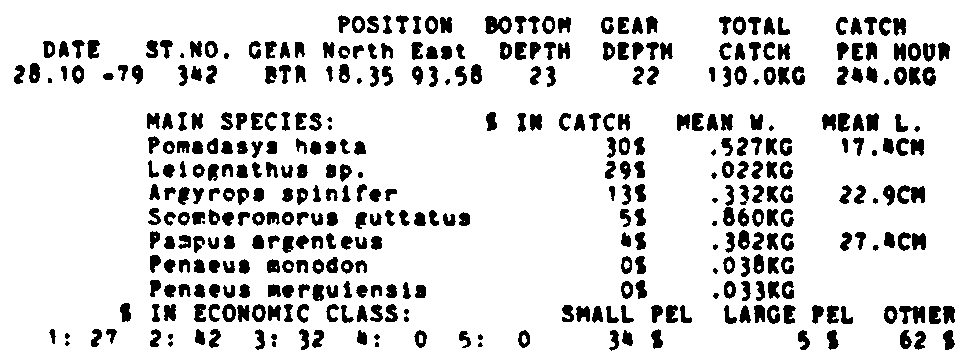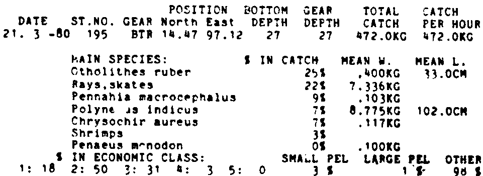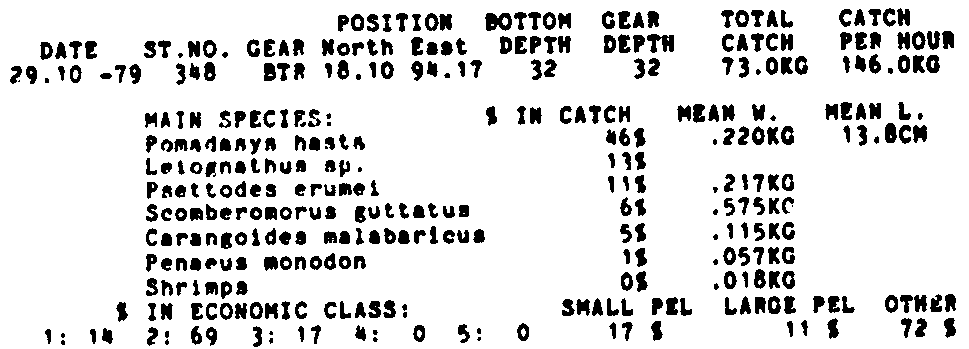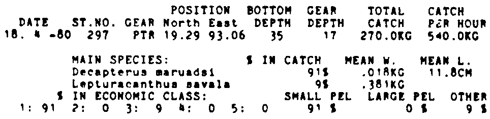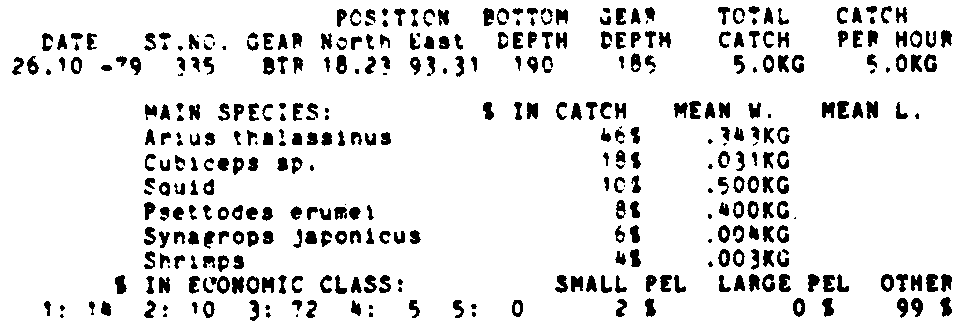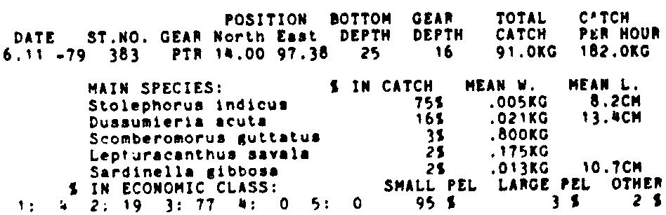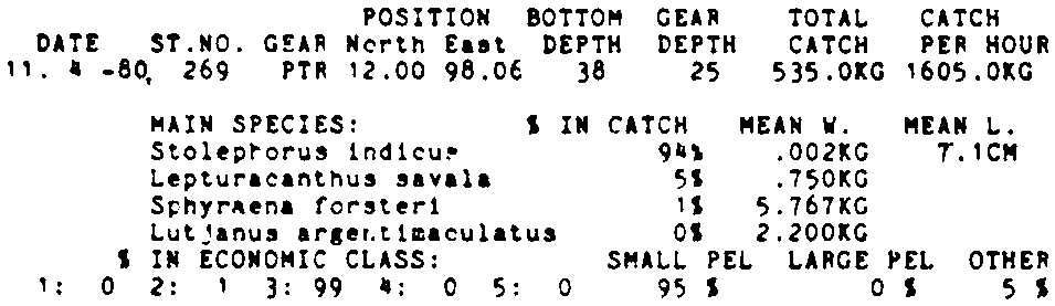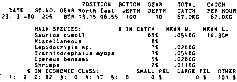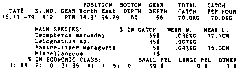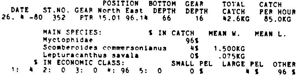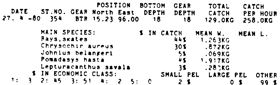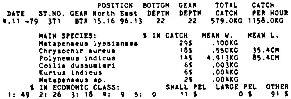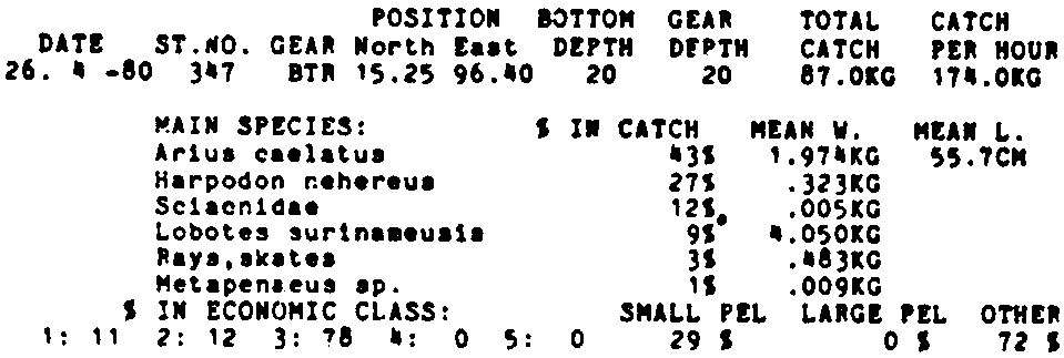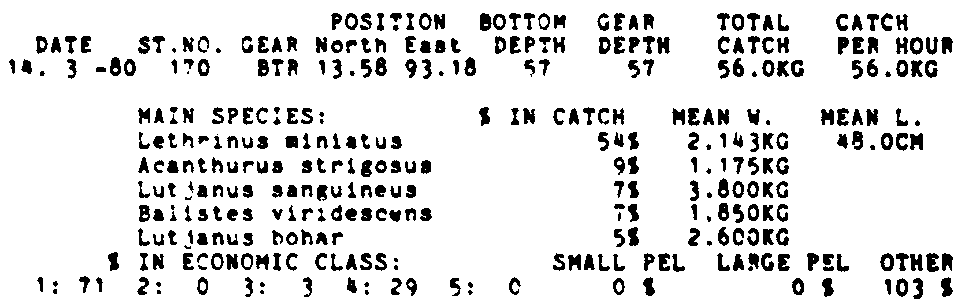 Only the five most important species are listed plus all shrimp catches. For some of the species the percentage of total catch is given as 0%. This means that the species in question is present at the station, but is less than 1% of the total catch.