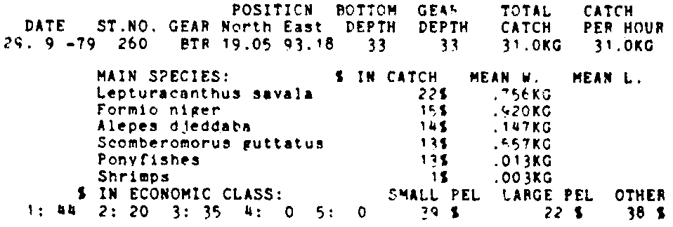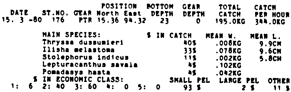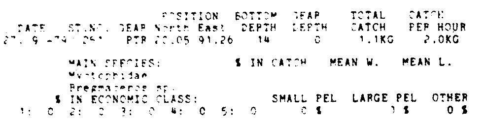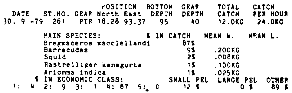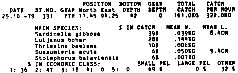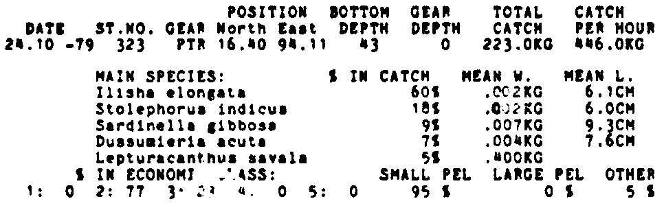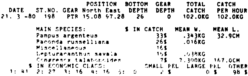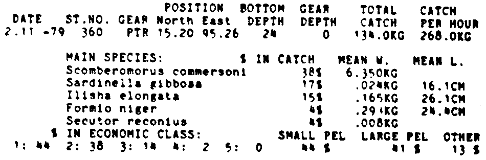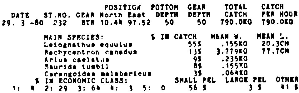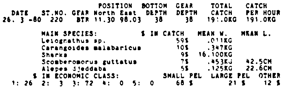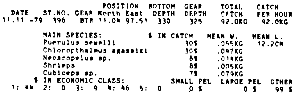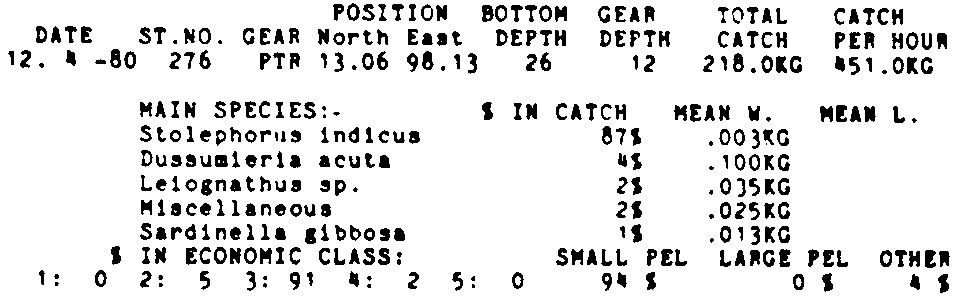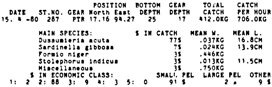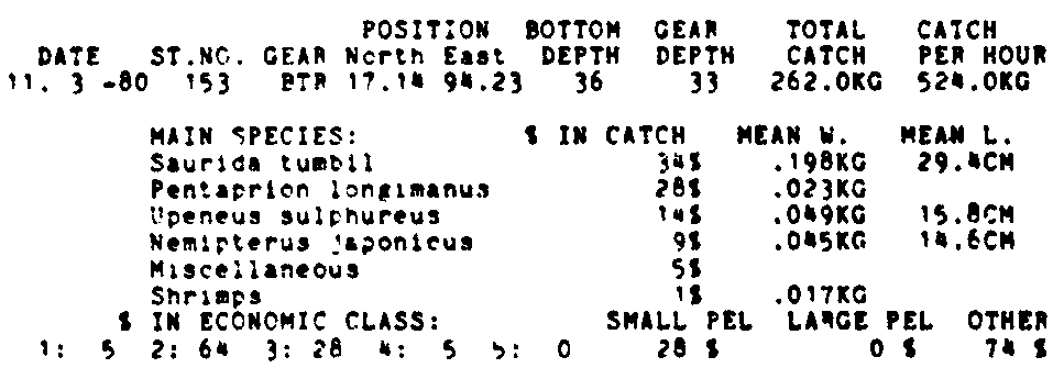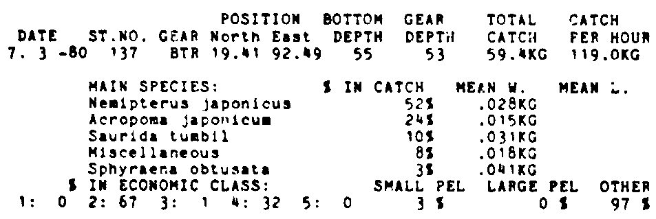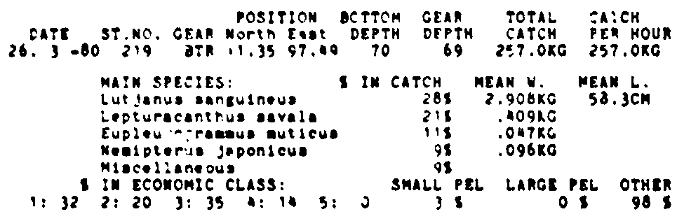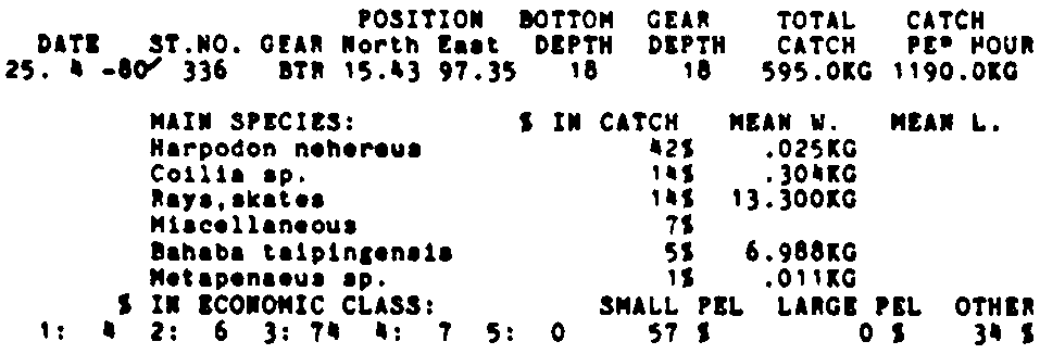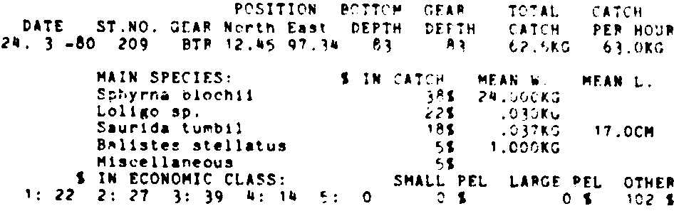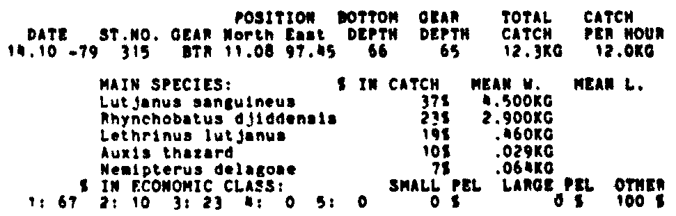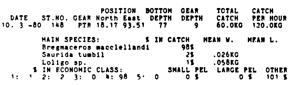 Only the five most important species are listed plus all shrimp catches. For some of the species the percentage of total catch is given as 0%. This means that the species in question is present at the station, but is less than 1% of the total catch.